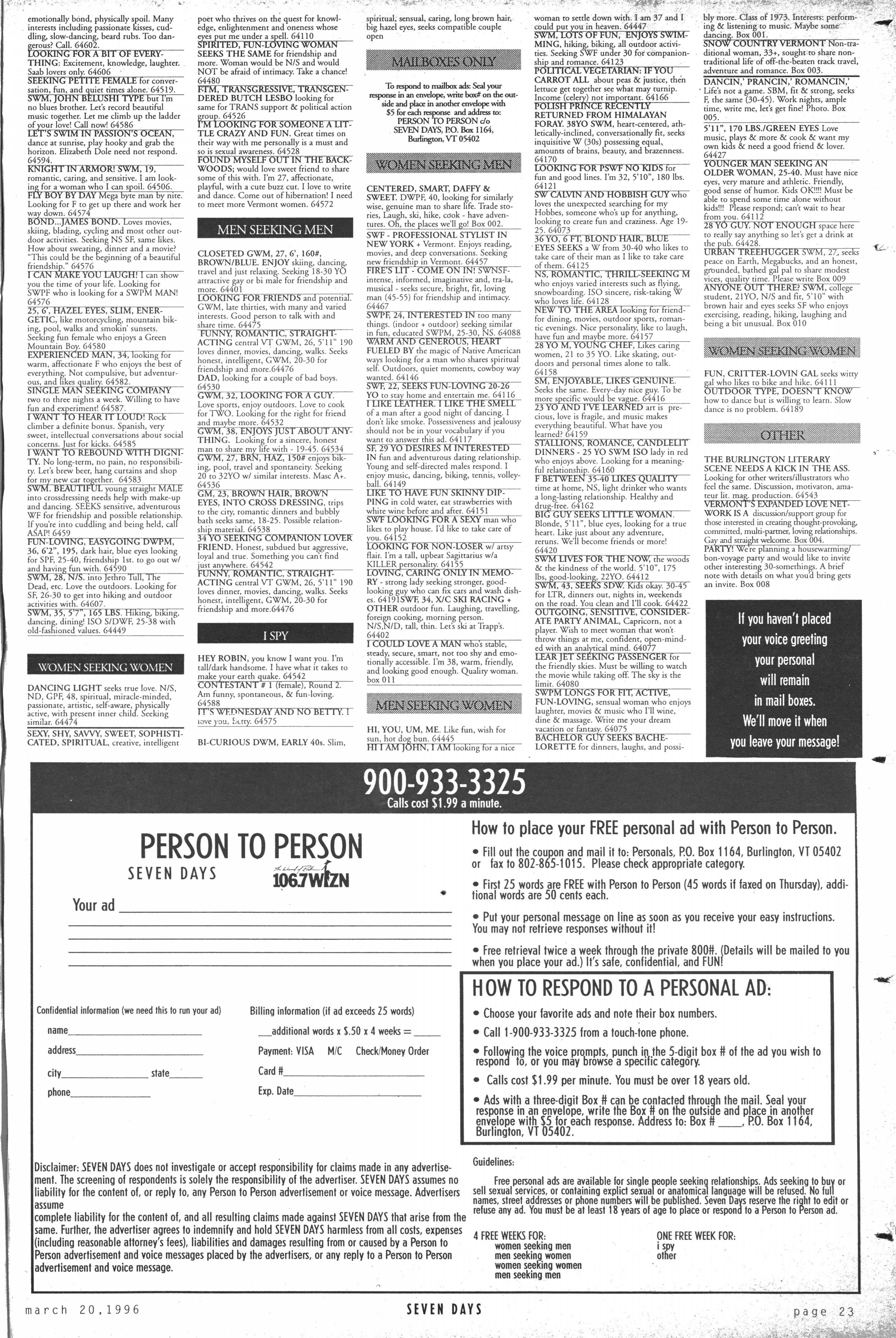 Torespondto mailbox ads Seal your response in an envelope, write box# on the outside and place in another envelope with $5 for eachresponseand address to: PERSON TO PERSON c/o SEVEN DAYS, PO Box 1164, Burlington, VT 05402