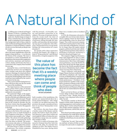 n a hilltop grove at Bread and Puppet Theater in Glover, a painting of an evergreen on a piece of tin is nailed to a pine tree. Nearby hangs an image of a barn, rusted by time. On yet another trunk is a painting of a horse against a blue background. Each of these, made by artist and Bread and Puppet founder Peter Schumann, is a kind of trail blaze: a splotch of color on a tree that leads you deeper into the woods. To follow his artwork into the pines — above the grassy amphitheater where the puppet troupe performs — is to discover the history of the company. The story is presented in a series of handmade art installations that memorialize puppeteers and activists, musicians and teachers, writers, family and friends who have a connection to the company Peter founded 56 years ago. Among the trees, a work that honors a Holocaust survivor was reconfigured when weather took down the original structure. Paintings of a cloud and a horn, a bird and a candle have faded or fallen to the ground. Small buildings made of scrap wood have been buffeted by the wind or worn down by the rain. “They weren’t built for lasting forever,” Peter told Seven Days one day last month on a tour of the installation. The impermanence of the memorial pieces echoes Peter’s idea of eternity itself. “There’s not much of it,” he said. “It’s ephemeral, even eternity.” The memorial village, as the puppeteers call it, is the work not only of Peter but also of his kids and collaborators and of family members of the deceased. Though the buildings and other installations have been in the woods for decades, the site has fewer visitors than the puppet-filled museum across the road or the pageants in the field. Small human figures placed near the entrance to the forest a few years ago — among the scores or maybe hundreds of such sculptures in the pines — will most likely attract more people to the “village” within. The advent of weekly gatherings there, a time to commemorate loved ones, has done so already. The memorial sessions take place on Wednesday evenings at 7 p.m. throughout the summer. The pine forest is a place of wonder and sanctuary. The wonder originates 30