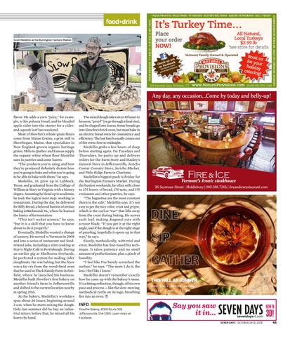 flavor: He adds a corn “juice,” for example, to his polenta bread, and he blended apple cider into the starter for a ciderand-squash loaf last weekend. Most of Slowfire’s whole-grain flours come from Maine Grains, a grist mill in Skowhegan, Maine, that specializes in New England-grown organic heritage grains. Mills in Québec and Kansas supply the organic white wheat flour Medellin uses in pastries and some loaves. “The products you’re using and how they’re produced definitely dictate how you’re going to bake and what you’re going to be able to bake with them,” he says. Medellin, 35, grew up in Lubbock, Texas, and graduated from the College of William & Mary in Virginia with a history degree. Assuming he’d end up in academia, he took the logical next step: working in restaurants. During the day, he delivered for Billy Bread, a beloved bastion of artisan baking in Richmond, Va., where he learned the basics of fermentation. “This isn’t rocket science,” he says, “but it is a skill that you have to know about to do it properly.” Eventually, Medellin wanted a change of scenery. He moved to Vermont in 2008 and into a series of restaurant and foodrelated jobs, including a stint cooking at Starry Night Café in Ferrisburgh. During an earlier gig at Shelburne Orchards, he perfected a system for making cider doughnuts. He was baking, but the fryer was a far cry from the wood-fired oven that he used at Flack Family Farm in Fairfield, where he launched his business. Medellin built Slowfire’s first bakery on another friend’s farm in Jeffersonville and shifted to the current location nearby in spring 2016. At the bakery, Medellin’s workdays span about 20 hours, beginning around 2 a.m. when he starts mixing the dough. Only last summer did he buy an industrial mixer; before that, he mixed all his loaves by hand.