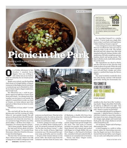 someone you barely knew. That day in his Burlington cooler, he told me about the ducks hanging there and smoking over jasmine tea and hickory chips. In Stowe, eating in an open-air refrigerator, we talked about cooking with a wok. (It’s properly seasoned, he told me, “by the time you throw it away” — after four or five weeks of heavy, high-heat restaurant use.) We discussed hot-andsour soup, pork belly, and rice noodles — all part of the Umami takeout on the picnic table. We drank soup from the containers and beer from 16-ounce cans