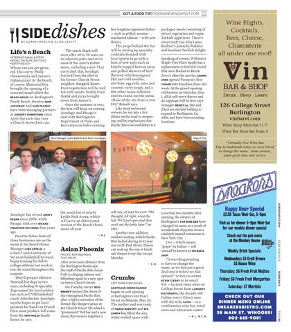 packaged meals consisting of mixed vegetarian and vegan Turkish appetizers. There’s sweet stuff, too: Don’t miss Bozkurt’s pistachio baklava and hazelnut Turkish delight. Speaking of sweets, Williston’s Maple Tree Place finally has a replacement to feed the crowd that once flocked to Ben & Jerry’s after the movies. shawn zhEn opened Vermont’s first Yogurt cItY franchise there last week. At the grand-opening celebration on Saturday, June 1, all 14 self-serve flavors and 42 toppings will be free, says manager wEnDY Lu. She and Zhen are already looking to expand to Burlington, Lu adds, and have been scouting locations.