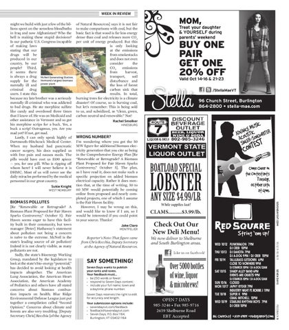 wEEk iN rEViEw might we build with just a few of the billions spent on the senseless bloodbaths in Iraq and now Afghanistan? Who the hell is making these stupid decisions? Is our pathetic U.S. Congress incapable of making laws stating that our drugs will be produced in our country, by our people? Third, it seems there is always a drug McNeil Generating Station, supply for the Vermont’s largest biomass mentally ill and power plant criminal drug users. I state this because my late brother was a seriously mentally ill criminal who was addicted to bad drugs. He ate morphine sulfate like candy and overdosed three times that I know of. He was on Medicaid and other assistance in Vermont and so got his morphine scrips for a buck. Yes, a buck a scrip! Outrageous, yes. Are you mad yet? If not, get mad. Lastly, I can only speak highly of Dartmouth-Hitchcock Medical Center. When my husband had pancreatic cancer surgery, his docs supplied us with free pain and nausea meds. The pills would have cost us $100 apiece — yes, for one pill. Who is ripping off whom here? I will never believe it is DHMC. Most of us will never see the daily miracles performed by the medical personnel in our great country. Sukie knight
