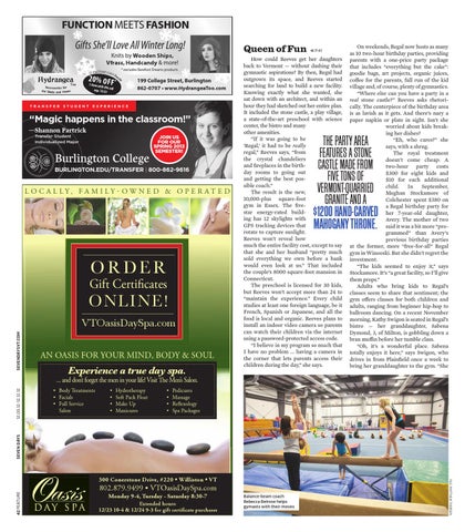 How could Reeves get her daughters back to Vermont — without dashing their gymnastic aspirations? By then, Regal had outgrown its space, and Reeves started searching for land to build a new facility. Knowing exactly what she wanted, she sat down with an architect, and within an hour they had sketched out her entire plan. It included the stone castle, a play village, a state-of-the-art preschool with science center, the bistro and many other amenities. “If it was going to be ‘Regal,’ it had to be really regal,” Reeves says, “from the crystal chandeliers and fireplaces in the birthday rooms to going out and getting the best possible coach.” The result is the new, 10,000-plus square-foot gym in Essex. The fivestar energy-rated building has 12 skylights with GPS tracking devices that rotate to capture sunlight. Reeves won’t reveal how much the entire facility cost, except to say that she and her husband “pretty much sold everything we own before a bank would even look at us.” That included the couple’s 8000 square-foot mansion in Connecticut. The preschool is licensed for 30 kids, but Reeves won’t accept more than 24 to “maintain the experience.” Every child studies at least one foreign language, be it French, Spanish or Japanese, and all the food is local and organic. Reeves plans to install an indoor video camera so parents can watch their children via the internet using a password-protected access code. “I believe in my program so much that I have no problem ... having a camera in the corner that lets parents access their children during the day,” she says.