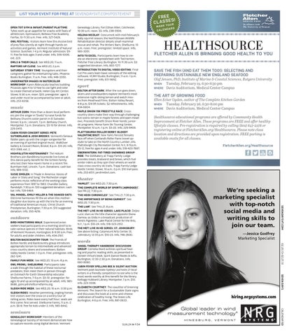 liSt Your EVENt for frEE At SEVENDAYSVT.COM/POSTEVENT Open TOT Gym & InfanT/parenT playTIme: Tykes work up an appetite for snacks with feats of athleticism. Gymnasium, Bellows Free Academy, Fairfax, 10-11:30 a.m. Free. Info, 527-5426. Owl fesTIval: Visitors learn how this elusive bird of prey flies silently at night through hands-on activities and games. Vermont Institute of Natural Science, Quechee, 1-4 p.m. Regular admission, $911; free for kids ages 3 and under. Info, 359-5000, ext. 223. Owls & TheIr Calls: See WED.20, 11 a.m. rapTOrs Up ClOse: See WED.20, 2 p.m. saTUrday sTOry TIme: Youngsters and their caregivers gather for entertaining tales. Phoenix Books Burlington, 11 a.m. Free. Info, 448-3350. UnderwaTer ImaGes In waTerCOlOr wOrkshOp: Karen Abbruscato teaches budding Picassos ages 4 to 12 how to use light and color to create themed artwork. Helen Day Art Center, Stowe, 9:30 a.m.-noon. $25; preregister; ages 5 and under must be accompanied by teen or adult. Info, 253-8358.