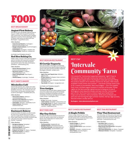 Other finalists: • Great Harvest Bread Co.: Burlington • greatharvestburlington.com • Klinger’s Bread Company: South Burlington • klingersbread.com • Knead Bakery: Burlington • kneadvt.com • O Bread Bakery: Shelburne • obread.com