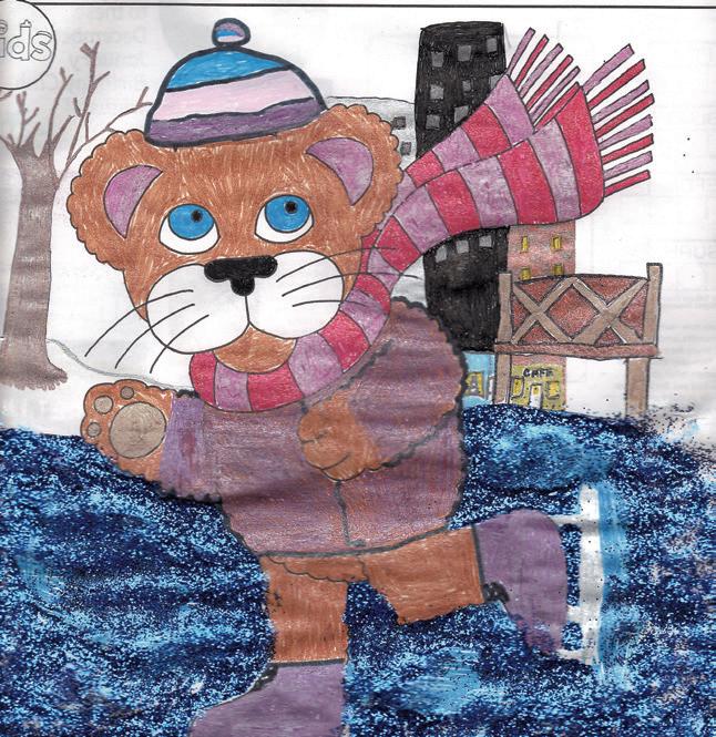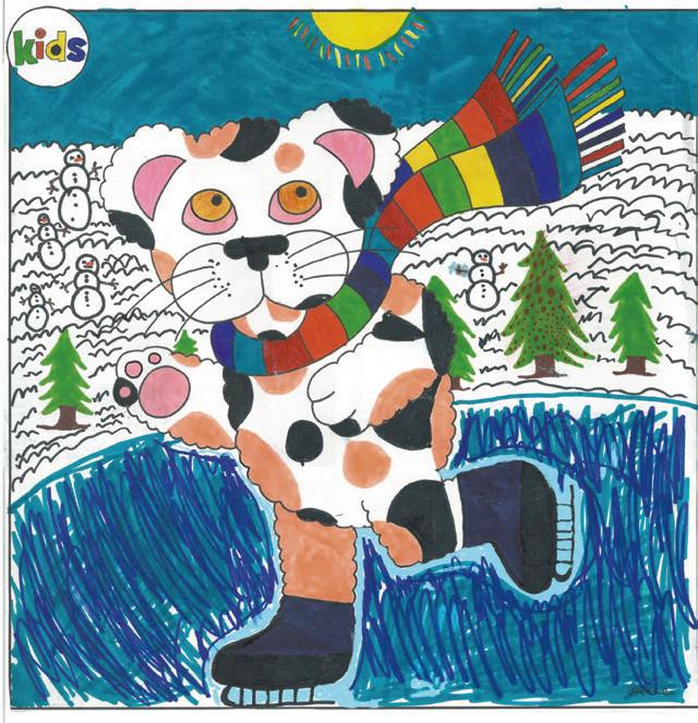 Kids’ works of art were filled with gliding ice skates and glittering snowflakes this month. Interestingly, some young artists saw the drawing as a bear, while others considered it a cat. Eightyear-old Maya’s teddy danced through the season’s first snowfall under a turquoise sky. Elizah, 12, dressed up a Santa bear in a cherry-red suit, with pasted-on jewels for extra flair. Five-year-old Blakely’s furry friend skated on blue ice, with a fluttering rainbow scarf trailing behind. Marvelous work, kids. We can’t wait to see your imaginative creations this month!
