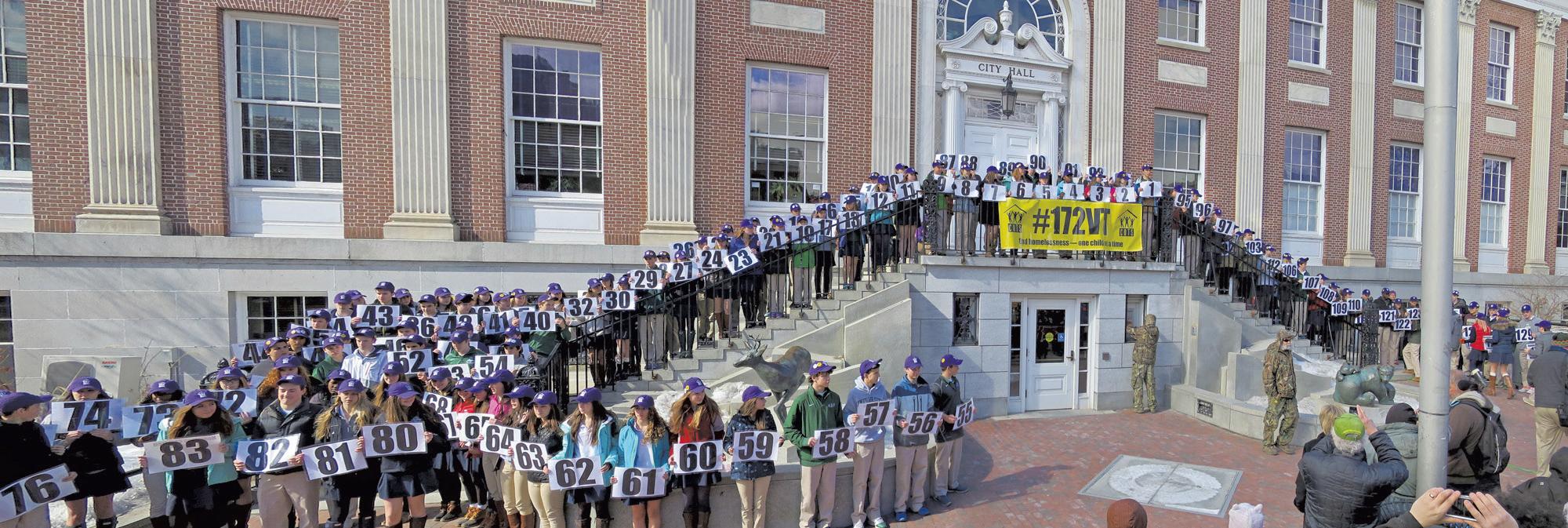 vermonters visualize the problem. last month, teenagers from rice Memorial High school slowly filed out of yellow school buses and onto the steps of Burlington City Hall. each student held a laminated number, from one to 172 — the number of homeless children in Chittenden County.
