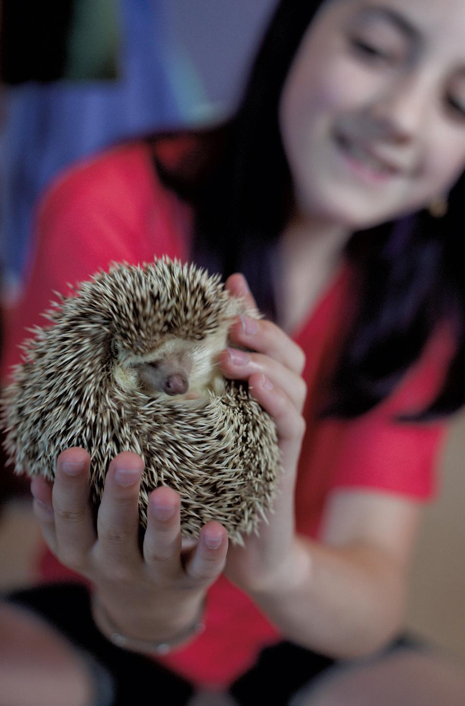 Her prickly pet “isn’t that hard to take care of,” says Livia. “He can be grumpy sometimes,” she concedes, probably because he doesn’t naturally like to be awake during the day, but “other than that, he is pretty fun.”