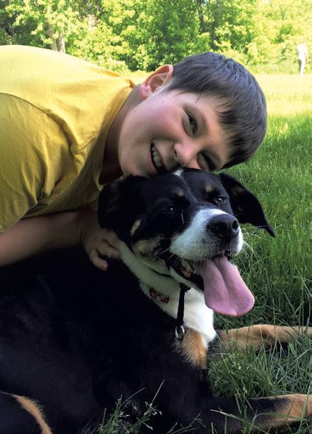 GINGER — age 3 (pictured with Graham, age 11). She’s an energetic pit bull/Bernese mountain dog/ coonhound mix who loves to nuzzle everyone she meets. She fits right in with our pack.