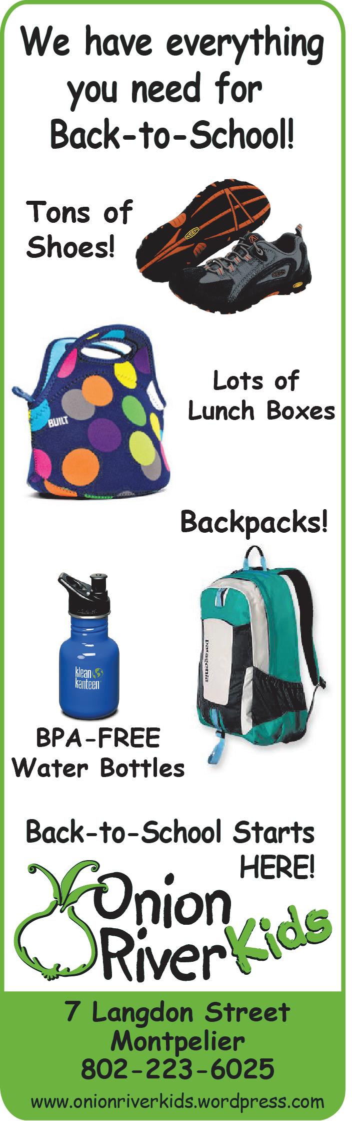 This month’s Kids VT also reports on the immunizations that children are required to get before starting school. Ken Picard’s feature (page 26) examines di ering perspectives on these vaccinations. An annotated photo (page 30) illustrates the ins and outs of backpacks, and this month’s craft (page 48) covers books with paper bags and contact paper. In “Go Ask Dad” (page 18), local fathers compare notes on negotiating with school-phobic kids.
