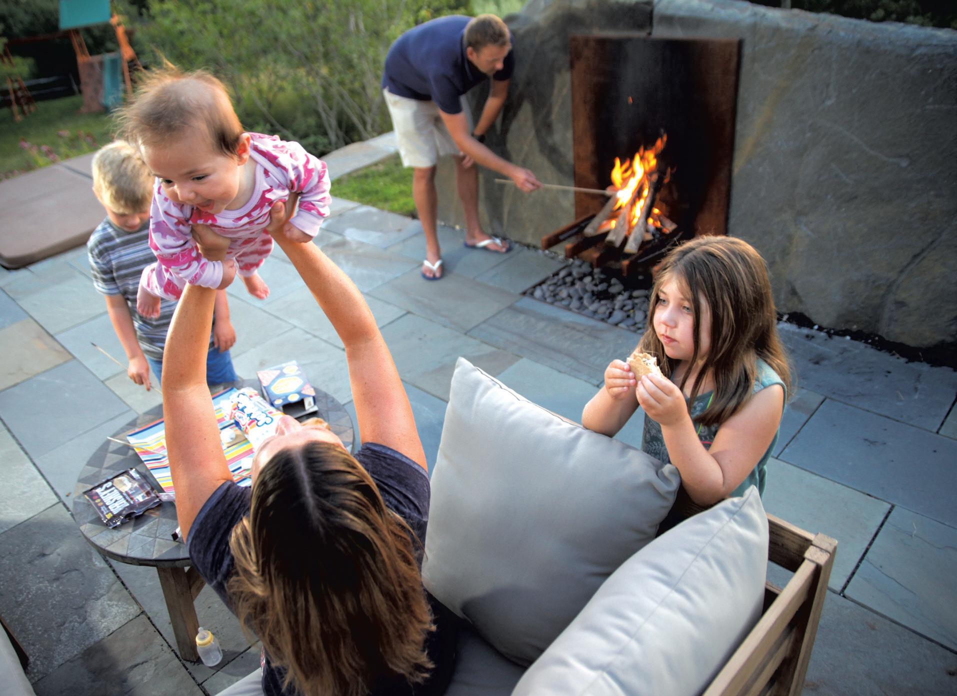 The Karpinski kids are especially pleased with the end product. Three-month-old Kassidy stays snug in her pajamas on gray couches set around the space, while Dylan, 8, loves the warmth at nighttime. Meanwhile, 6-year-old Morgan doesn’t miss a beat when asked her favorite aspect of the fire pit. “Sometimes,” she says, “we have s’mores.” K