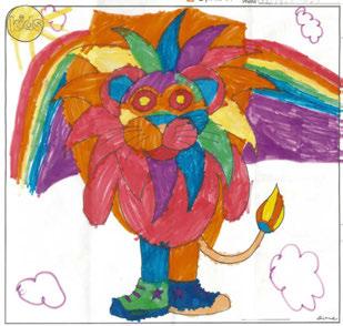Festive fall colors took center stage in this month’s amazing submissions. Saroura, 12, created a gold and amber lion wearing red shoes and surrounded by a backdrop of spirals. Four-year-old Brody dressed his lion in rainbowcolored socks and jazzed up the tip of his creature’s tail with florescent orange and purple. Evan, 6, mailed in a masterpiece with bright turquoise eyes and lemonyellow fur. What a fantastic batch of felines, kids. Send us your most marvelous work again in September.