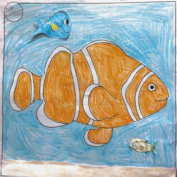 This month, artists took their imaginations into the briny, deep sea. We received aquatic masterpieces surrounded by swishing seaweed, teeming with turtles and gleaming with glitter. Zoryan Ivakhiv-Gray, 5, drew a crimson coral reef around a blueand-rainbow-striped swimmer. Aly Dorman, 7, added a stylish top hat, miniature goatee and mustache to her fish. Twelve-year-old Sierra Matte gave her creation some backto-school flair, with a math book, erasers, notebook and pencil floating by her lemon-colored beauty. The entries reeled in the judges, who marveled at all the amazing artwork. We’re already looking forward to next month!