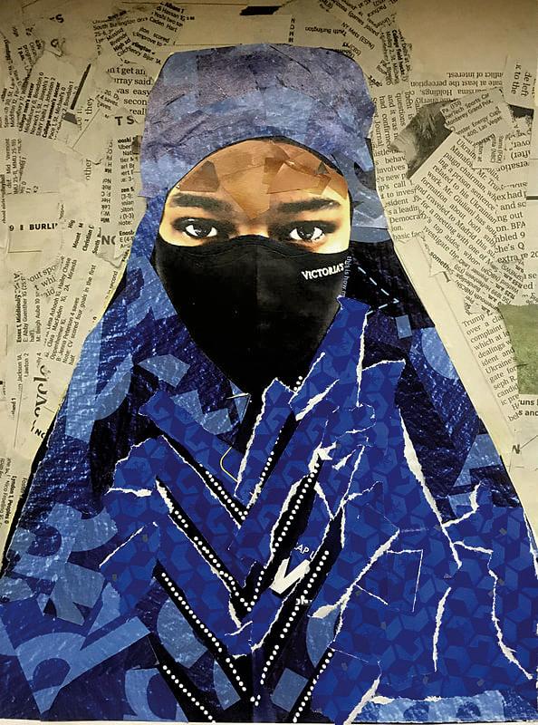 Judy Klima, art teacher at Edmunds Middle School in Burlington, shared this pandemic-related work created by her students. After looking at the work of contemporary collage artists Patrick Bremer, David Hockney, Benon Lutaaya and Derek Gores, seventh and eighth graders created their own masked collage portraits using magazines and paper from old books and maps. Sixth graders made Coronavirus Word Art pieces using encyclopedia pages, black Sharpies and watercolors.