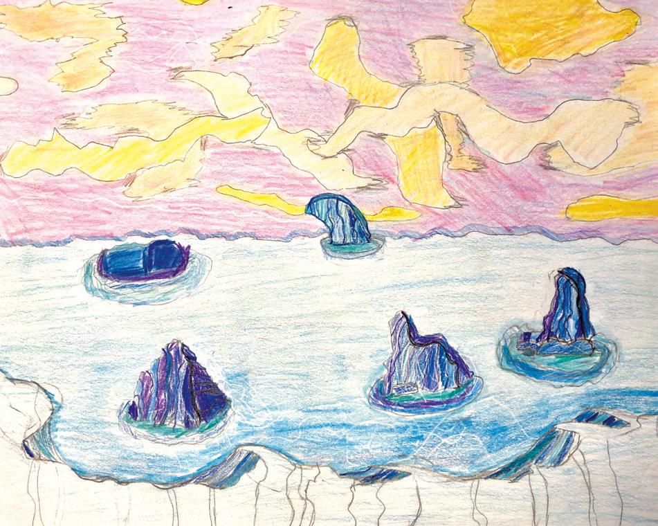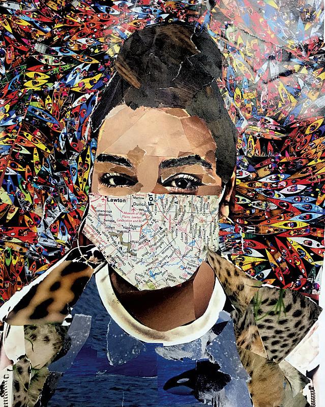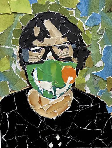 Judy Klima, art teacher at Edmunds Middle School in Burlington, shared this pandemic-related work created by her students. After looking at the work of contemporary collage artists Patrick Bremer, David Hockney, Benon Lutaaya and Derek Gores, seventh and eighth graders created their own masked collage portraits using magazines and paper from old books and maps. Sixth graders made Coronavirus Word Art pieces using encyclopedia pages, black Sharpies and watercolors.