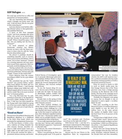 conservatism,” but now he wonders whether the GOP is still “good on race.” For a political consultant who has made his fortune winning in politics, it’s both a moral and a practical concern. When he moved to Austin in 1999 to work on Bush’s media team, the first footage Stevens shot of the Texas governor came from a bridge-opening ceremony on the Mexican side of the border. The first ad the campaign ran in Iowa that year focused on Latino voters. “Probably five Hispanics were going to caucus, but we thought it was so important to send a signal — to define Bush,” he said. That year, according to the Pew Research Center, 13.2 million Hispanics were eligible to vote. By 2016, 27.3 million were. In the same period, the number of eligible white voters declined from 78 to 69 percent of the electorate. “Trump’s base is high school- or lesseducated white voters,” Stevens noted. “Unless white people can figure out how to stop dying — which, as a white person, I’m all for — I’m skeptical Republicans can keep winning.” Stevens first met Trump during the 2012 campaign when the New York real estate developer endorsed Romney at his Nevada hotel and then demanded,