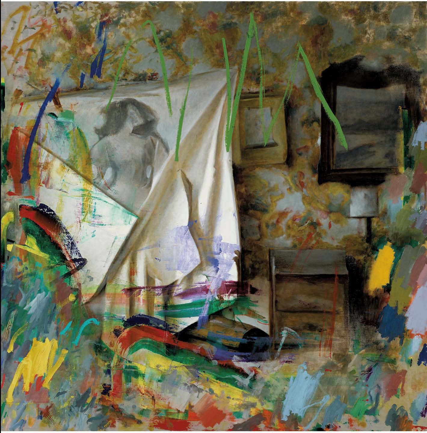 Damian Stamer (American, born 1982), Collaboration 35 (Angel 1): My photographic childhood memory exploring the bedroom of an abandoned rural North Carolina house filled with old junk. Hoarder, floor to ceiling. Mildewed sheets, stained blankets, strong tonal shifts. Old painting hanging on the wall., 2024, oil on linen, 72 x 72 x 2 inches.© Damian Stamer.