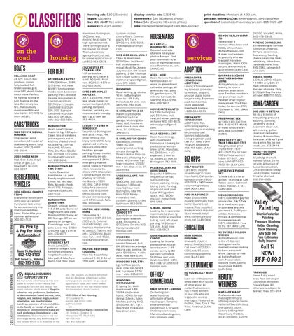 print deadline: Mondays at 4:30 p.m. post ads online 24/7 at: sevendaysvt.com/classifieds questions? classifieds@sevendaysvt.com 865-1020 x37