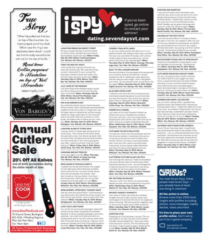 Lunching aLone at stone souP I saw you three (?) weeks ago having lunch at Stone Soup. I was sitting on the bench along the wall with a man. You almost sat down next to me but then sat alone near the front window. You were wearing a T-shirt and a grey/green cap. After, I said to my friend, “How do I meet that guy?” When: Friday, may 9, 2014. Where: stone soup. You: man. me: Woman. #912210 sunshine anD butterFLies I miss your light in my life. When: Thursday, may 29, 2014. Where: it’s been too long. You: Woman. me: man. #912209 geek squaD at mcguiLLicuDDY’s I walked into the bar with friends. You caught my eye right away. We locked eyes multiple times across the bar. You wore a Geek Squad shirt and sat between two friends. I feel like I’ve seen or met you before. If we have, I don’t know why I didn’t give you my number. Hopefully we’ll meet again so I can. When: sunday, may 25, 2014. Where: mcguillicuddy’s Williston. You: man. me: Woman. #912208 WinDjammer, uPPer Deck, tuesDaY night Saw you with your blond friend. I commented on your black dress. We shared lots of eye contact, me with my two guy friends. I was in a blue shirt. Any interest? When: tuesday, may 27, 2014. Where: Windjammer. You: Woman. me: man. #912207
