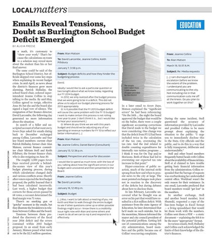 n math, it’s customary to “show your work.” That’s because the calculations en route to a solution may reveal more about the student than his or her final answer. The same could be said of the Burlington School District, but officials skipped over some key steps when explaining its recent budget crisis. In mid-April, as news about the district’s finances grew more alarming, Patrick Halladay, the school board chair, ordered superintendent Jeanne Collins to stop talking to the media. By mid-May, Collins agreed to resign, effective June 30, but she and the board also signed a legal vow of silence. The resignation of her finance director, David Larcombe, the following day generated no more information about the situation. In search of a fuller and unscripted account of what went awry, Seven Days asked for emails dating back to December exchanged among Collins, Larcombe and four key board members: current chair Patrick Halladay, former chair Alan Matson, current finance committee chair Miriam Stoll and Keith Pillsbury, the former finance chair, who is also resigning on June 30. The roughly 3,300 pages Seven Days received provide a behindthe-scenes view of this year’s budget planning process, during which calculations changed daily and various conflicts arose. Shortly after voters rejected the first budget proposal, the public learned that it had been calculated incorrectly. Last week, a higher budget that corrects for those errors passed by 68 votes; a recount determined the final margin was 71 votes. There’s no smoking gun or “gotcha” moment in the emails, but they illustrate the breakdown in relations between Collins and the board. Tensions between them predated the discovery of the fiscal year 2014 deficit and the errors contained within 2015 budget proposal. In an email from early January, Matson posed what turns out to be the $2.5 million question.
