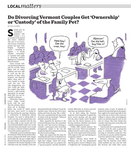 treated differently in divorce proceedings than, say, inanimate objects. In its April ruling, the Vermont Supreme Court disagreed. It upheld the lower court’s decision and also ruled that the state’s family courts shouldn’t wade into the thorny business of enforcing visitation schedules and shared custody arrangements for pets. “Unlike child custody matters,” the high court wrote, “there is no legislative authority for the court to play a continuing role in the supervision of the parties with respect to the care and sharing of a companion animal.” Baker’s attorney, Nanci Smith of Williston, says she was disappointed that the justices weren’t willing to issue a “bright-line rule” clarifying the special