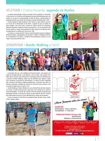 ATLETISME / Cristina Ferrando, segunda en Huelva La atleta benicarlanda Cristina Ferrando Forés participó el miércoles 10 de junio en la XI edición del Meeting Internacional Iberoamericano de Huelva, en la que es su especialidad, el salto de altura, clasificándose en segunda posición por detrás de la polaca Urszula Gardzielewska (1,85). Cristina superó el listón situado a 1,82 metros, lo que supone una mejor marca de la temporada al aire libre, e igualar la que ya realizó en pista cubierta. Con esta marca, Cristina se coloca tercera en el Ranking Nacional Absoluto. Dadas las buenas sensaciones, no nos extrañaría que pronto supere su mejor marca personal (1,84), ya que en las últimas cinco competiciones ha saltado por encima de 1,80. La tercera y cuarta posición fueron respectivamente para las búlgaras Mirela Demireva, subcampeona de Europa en 2006 y medalla de bronce en el Mundial PC de 2001, y Venelina Veneva-Mateeva, atleta con una mejor marca personal de 2,04.