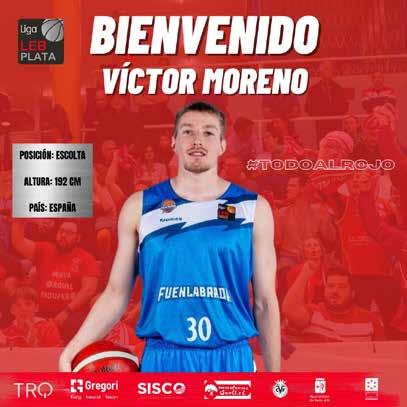 Víctor Moreno Martin juega de escolta. Mide 1’92cm de altura, es nacido en Alcorcón en enero de 1998 y tiene una amplia experiencia en competiciones FEB; ya que con 25 años ya ha estado 4 temporadas en LEB Oro y 4 temporadas en LEB Plata con diferentes equipos punteros (Ourense, Basquet Girona, Hestia Menorca, Palmer Basket, Albacete Basket y Fuenlabrada).