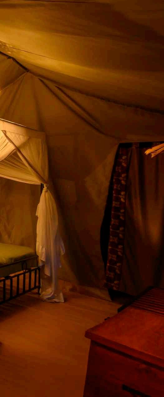 Mit acht komfortabel eingerichteten Zelten, jedes mit eigener Außendusche, garantiert das Camp eine ruhige und exklusive Atmosphäre. Das Design fügt sich harmonisch in die Natur ein und verbindet rustikalen Charme mit durchdachtem Komfort. Natürliche Materialien, sanfte Farbtöne und weite Ausblicke schaffen ein Gefühl der Harmonie und Einheit mit der Natur. Die Abende verbringen sie unter sternenklarem Himmel, begleitet von den fernen Geräuschen der Wildtiere.