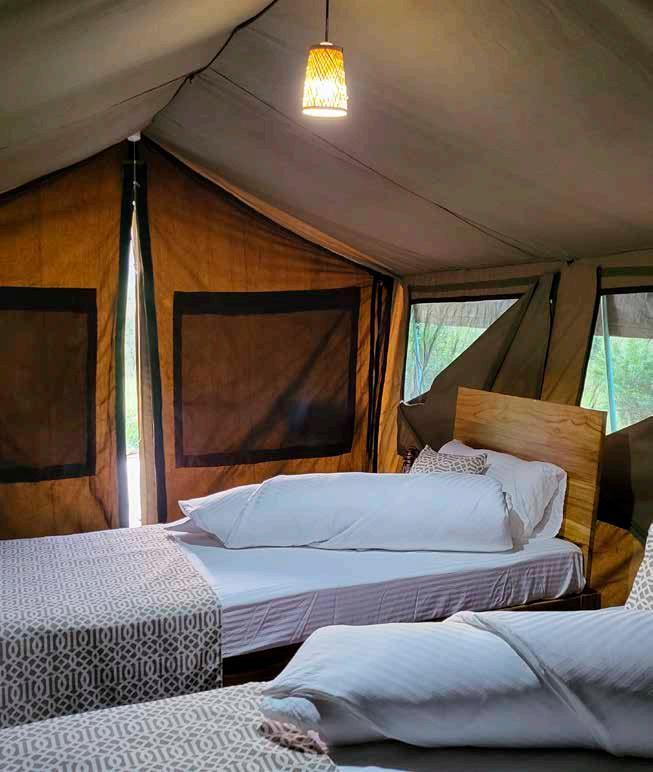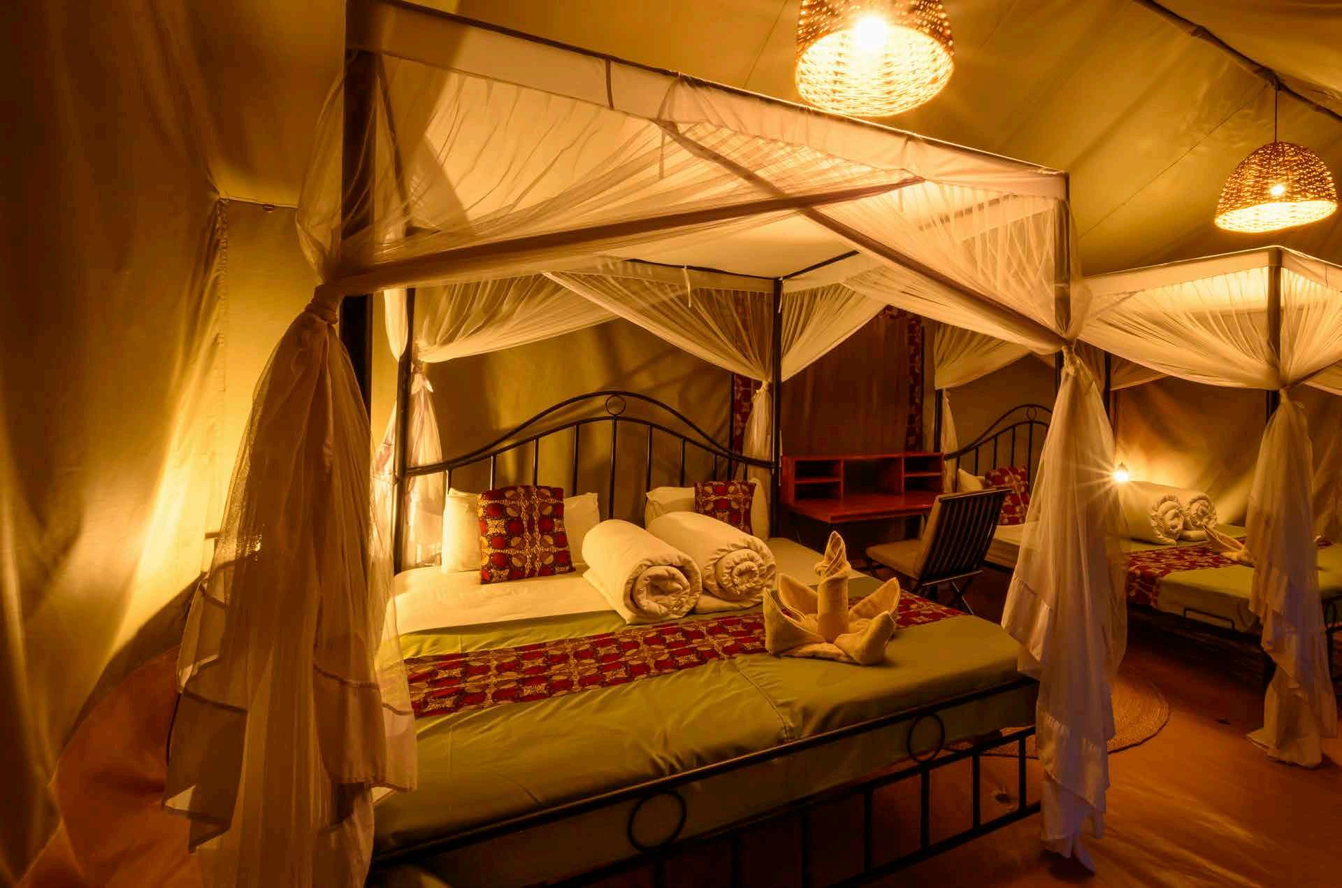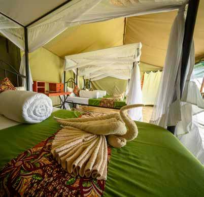 Das Camp bietet zehn komfortable Gästezelte, ein einladendes Restaurantzelt und eine gemütliche Lounge – ideal zum Entspannen nach einem erlebnisreichen Safaritag. Jedes geräumige Zelt ist geschmackvoll mit Doppel-, Drei- oder Vierbettzimmern sowie praktischen Annehmlichkeiten wie einem kleinen Schreibtisch, Regalen und einer Gepäckablage ausgestattet und bietet so Komfort und Funktionalität inmitten der Natur.