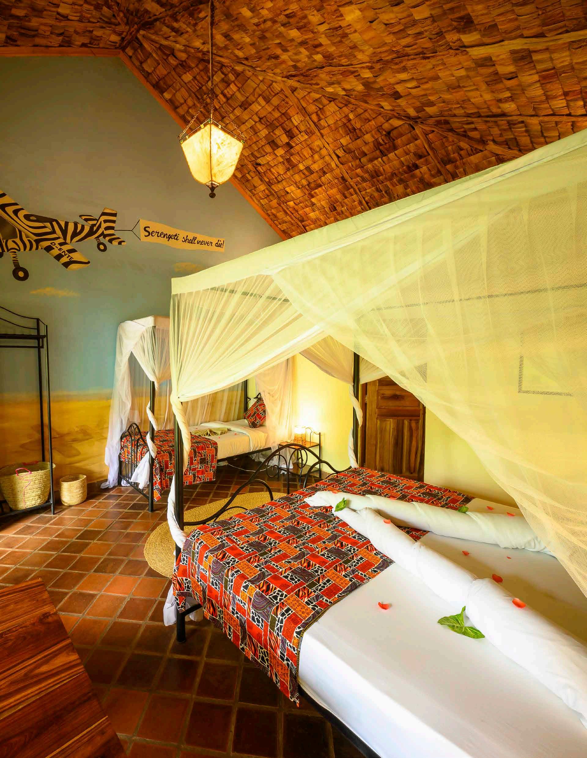 Die 10 charmanten Bungalows verfügen über 20 Zimmer mit eigenem Bad und atemberaubendem Blick auf den Mount Meru. Jedes Zimmer ist einem bestimmten tansanischen Thema gewidmet, sodass wir innerhalb einer Lodge eine kleine Reise durch Tansania anbieten, die Ihnen beispielsweise einen kurzen Einblick in den Tanganjikasee, die Massai und die Kilwa-Ruinen sowie die Serengeti und den Kilimanjaro gewährt.