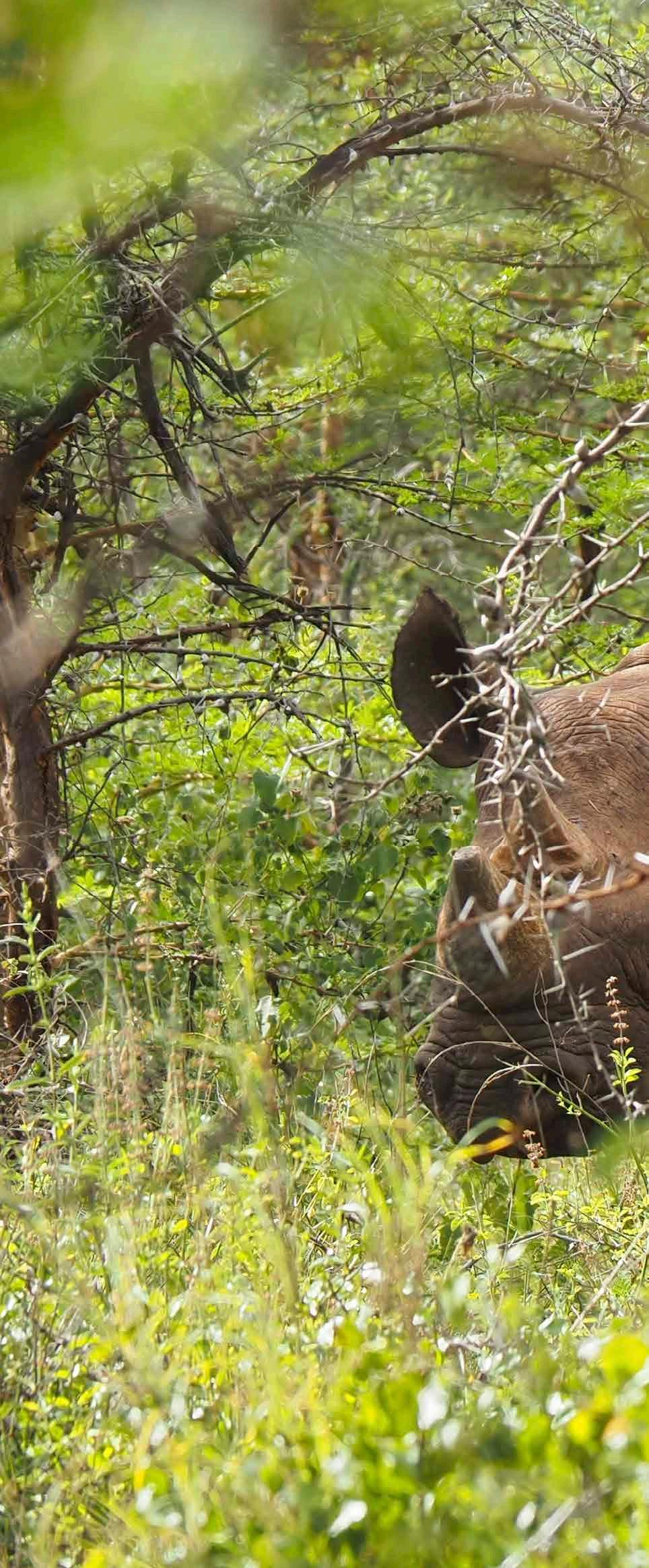 Nashornbeobachtung vom Fensterplatz eines Geländewagens aus – ganz nah dran im dichten Buschland von Mkomazi.
