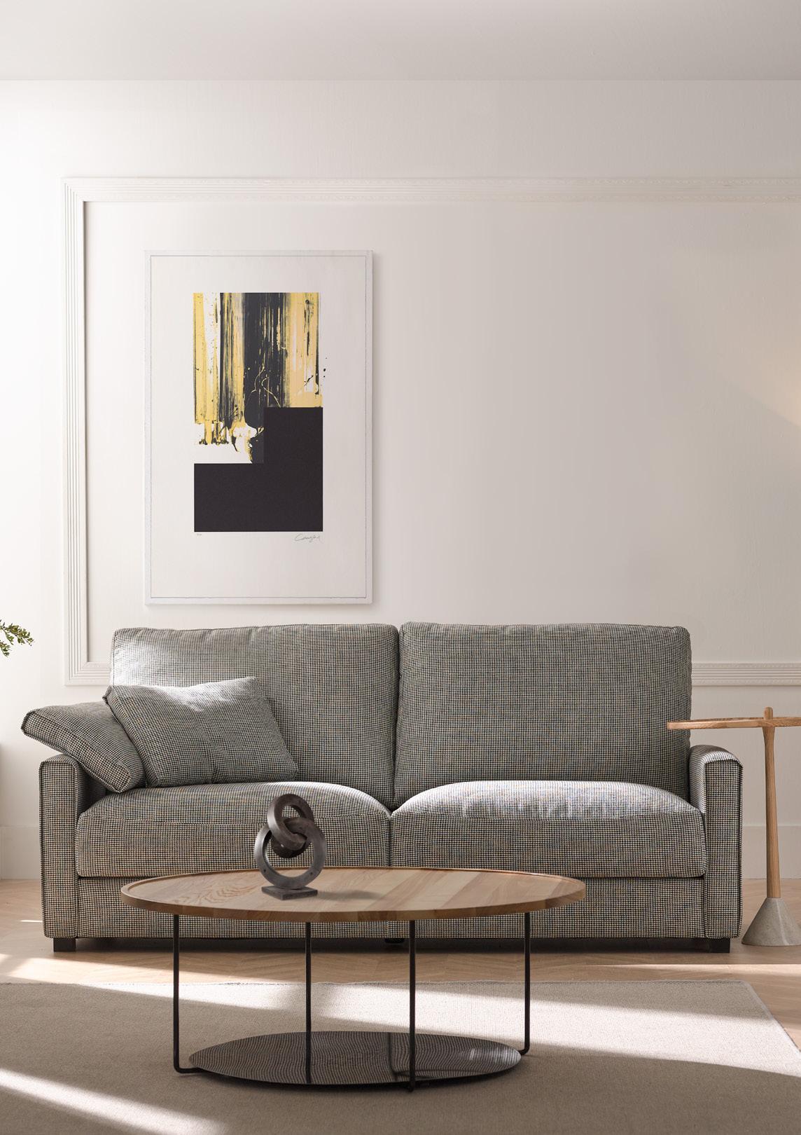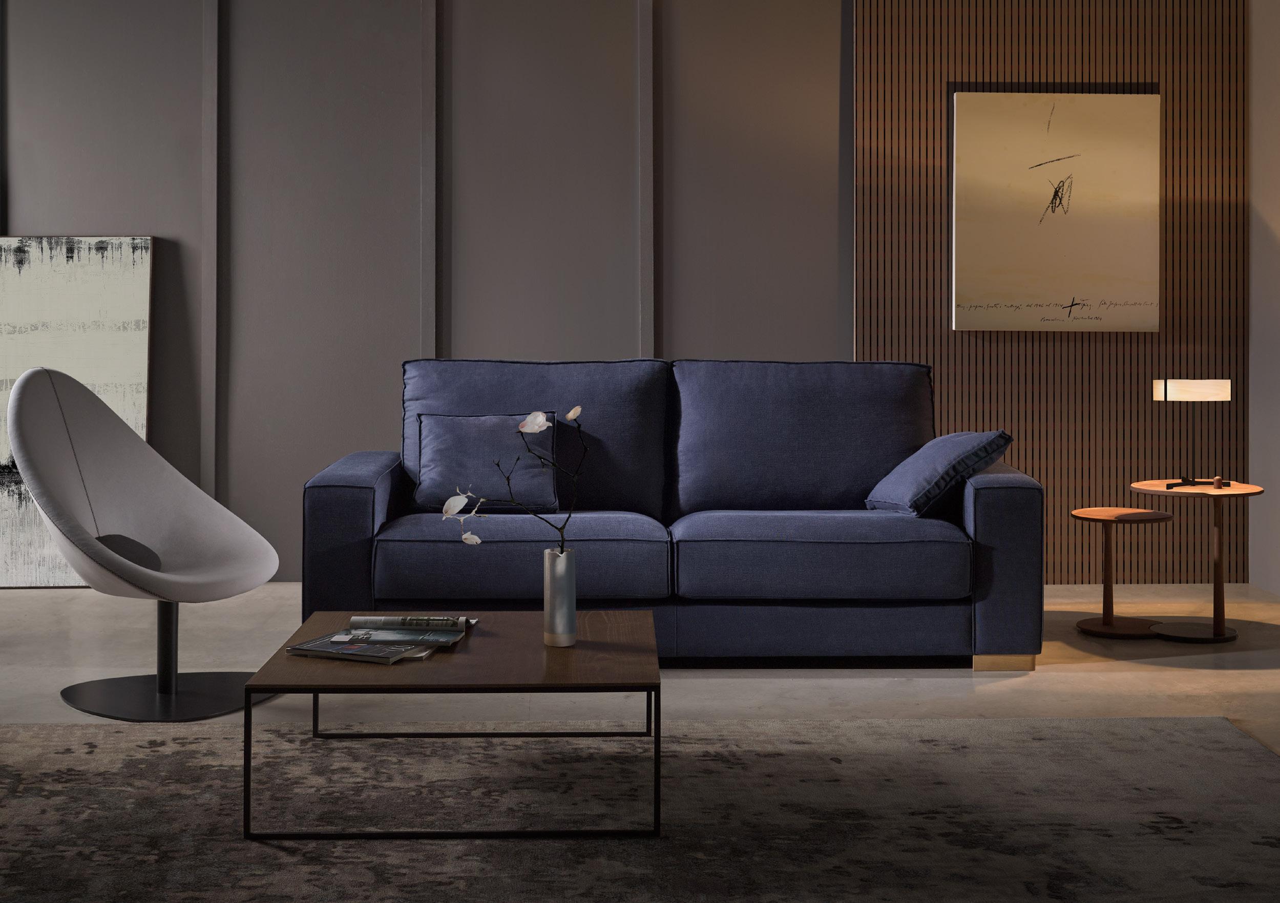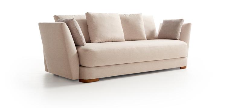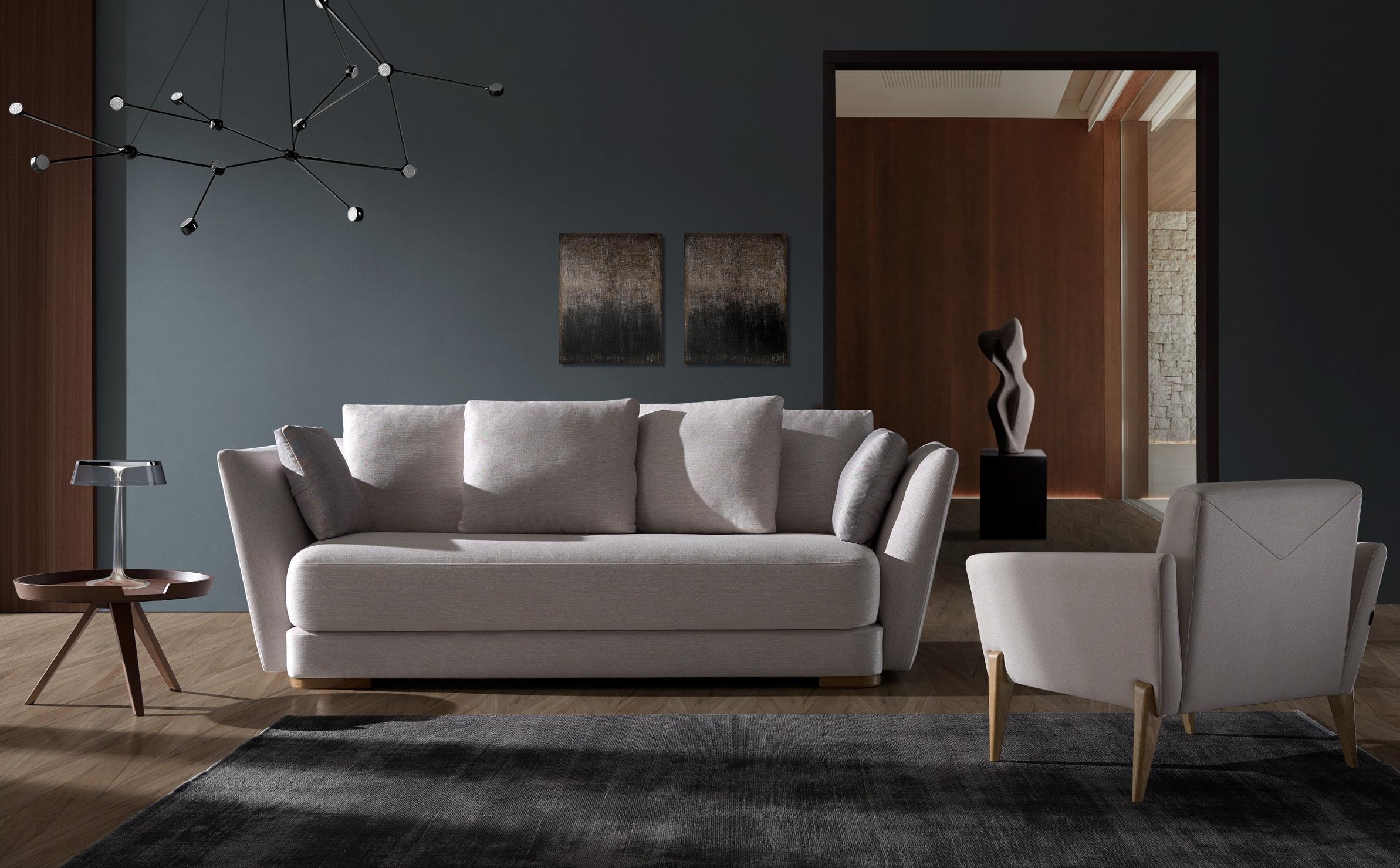 Oliv, contemporary sofa with a classic taste. This piece keeps the perfect balance of proportions, with a discreet presence, which nevertheless radiates a halo of comfort and spaciousness. Its outstanding comfort is mainly due to the pleasant softnesss of its upholstery, wich completely surrounds you and avoids direct contact with the hardest structural elements.