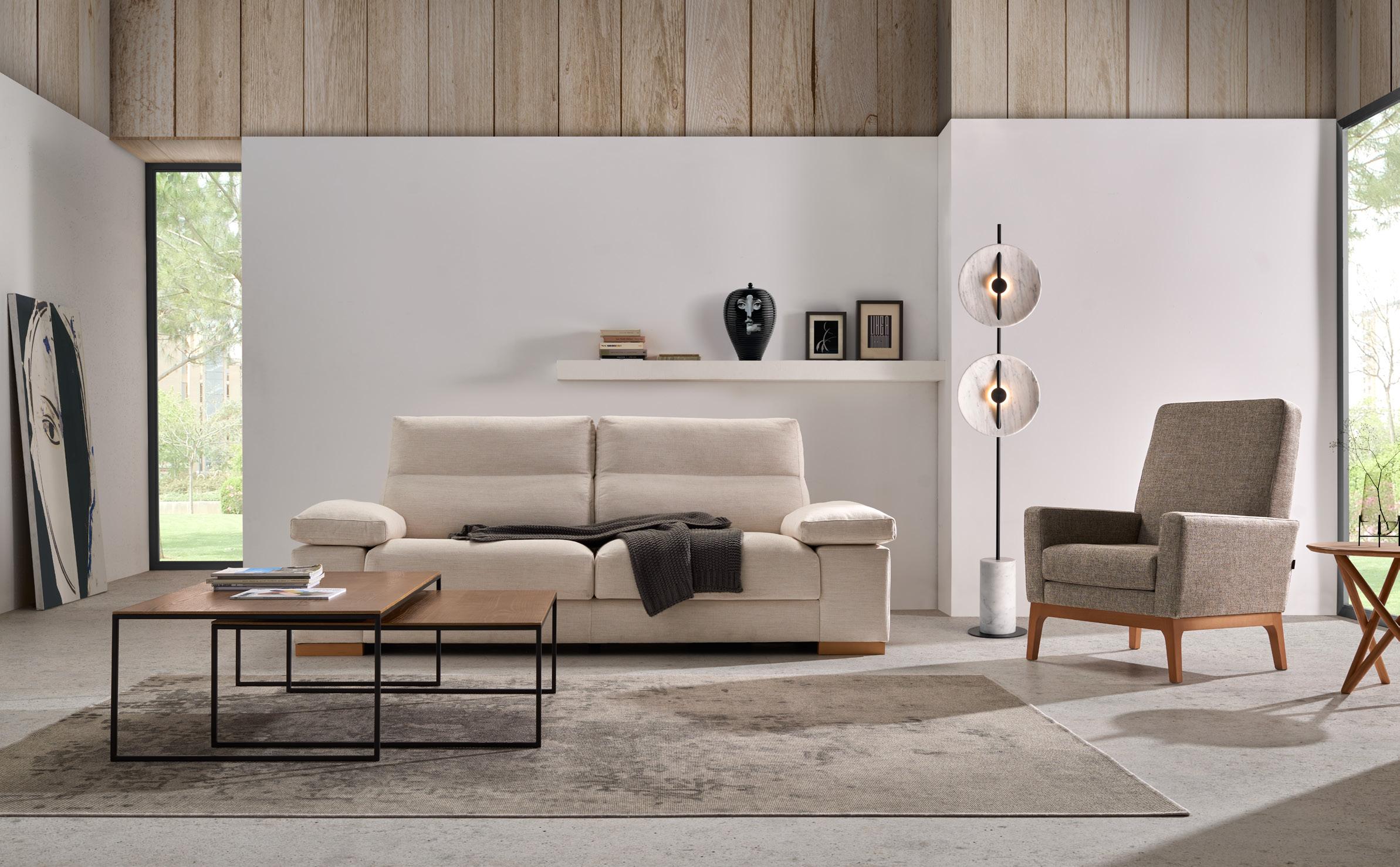 Nimo, modelo de línea actual en el que las formas compactas le atribuyen solidez y confort. El asiento, de gran espesor, ofrece una sentada elástica que se adapta a la perfección a distintas anatomías. Destacan los acabados de esta pieza, costuras y vivos cuidados hasta el más mínimo detalle que enmarcan y aligeran las formas de este sofá.