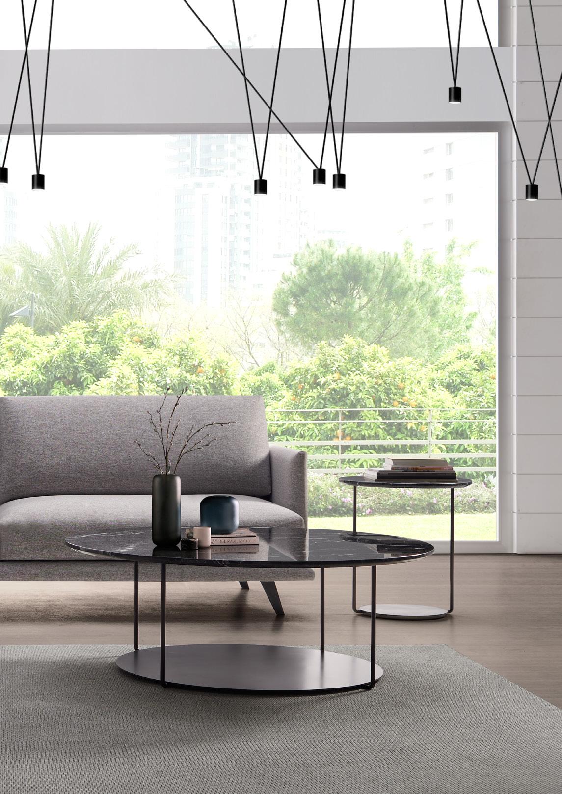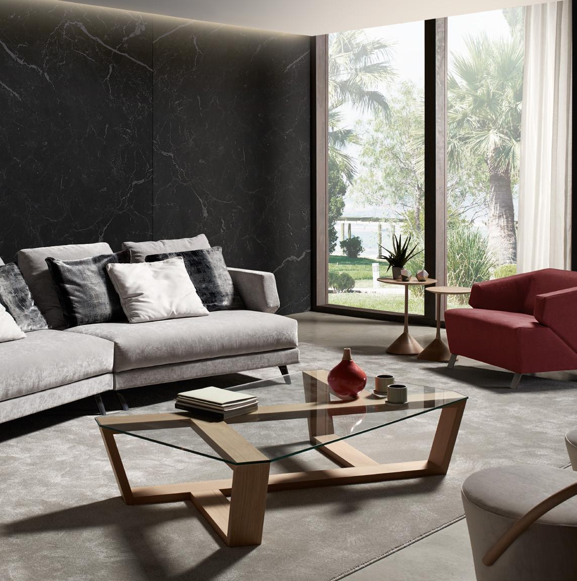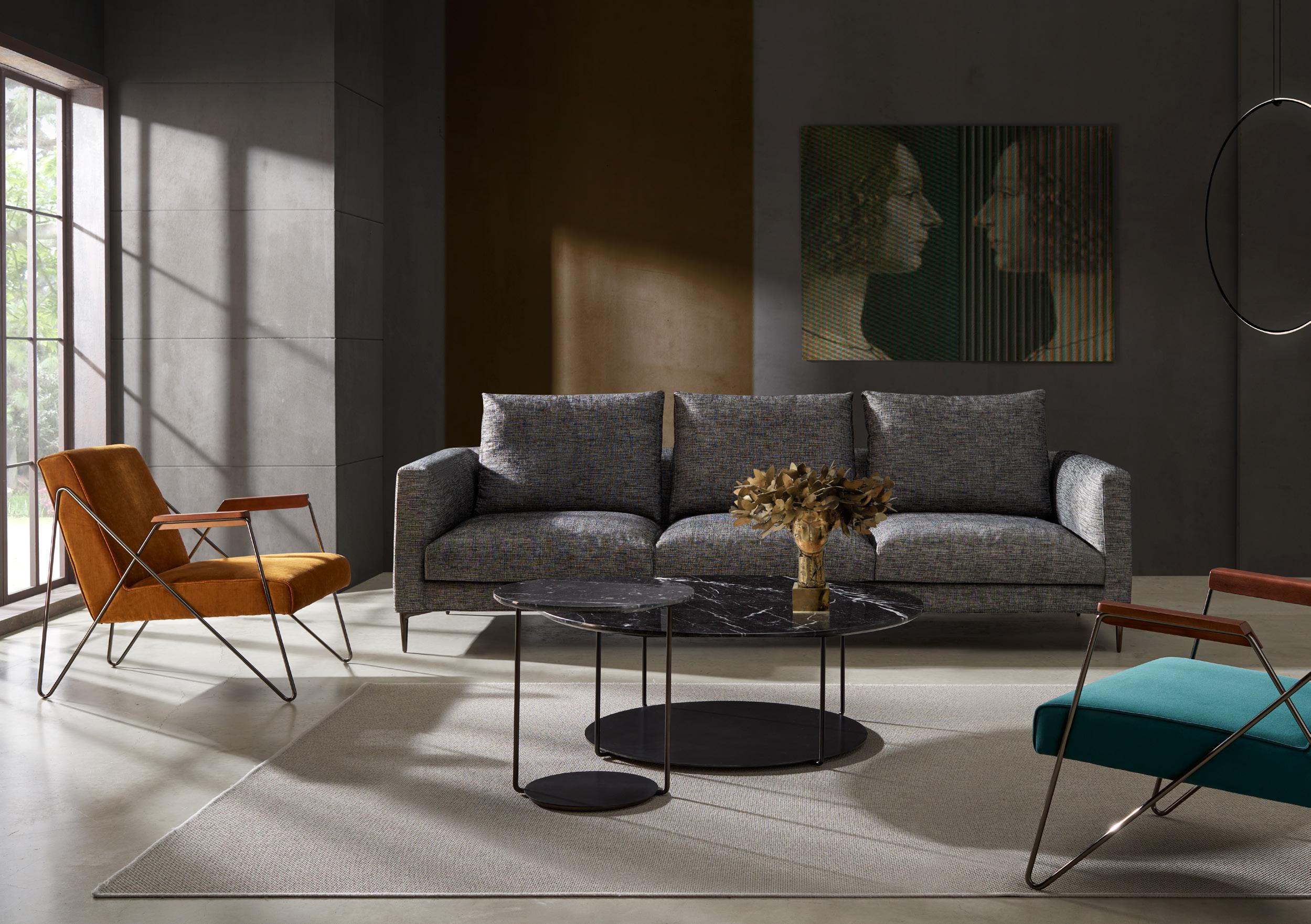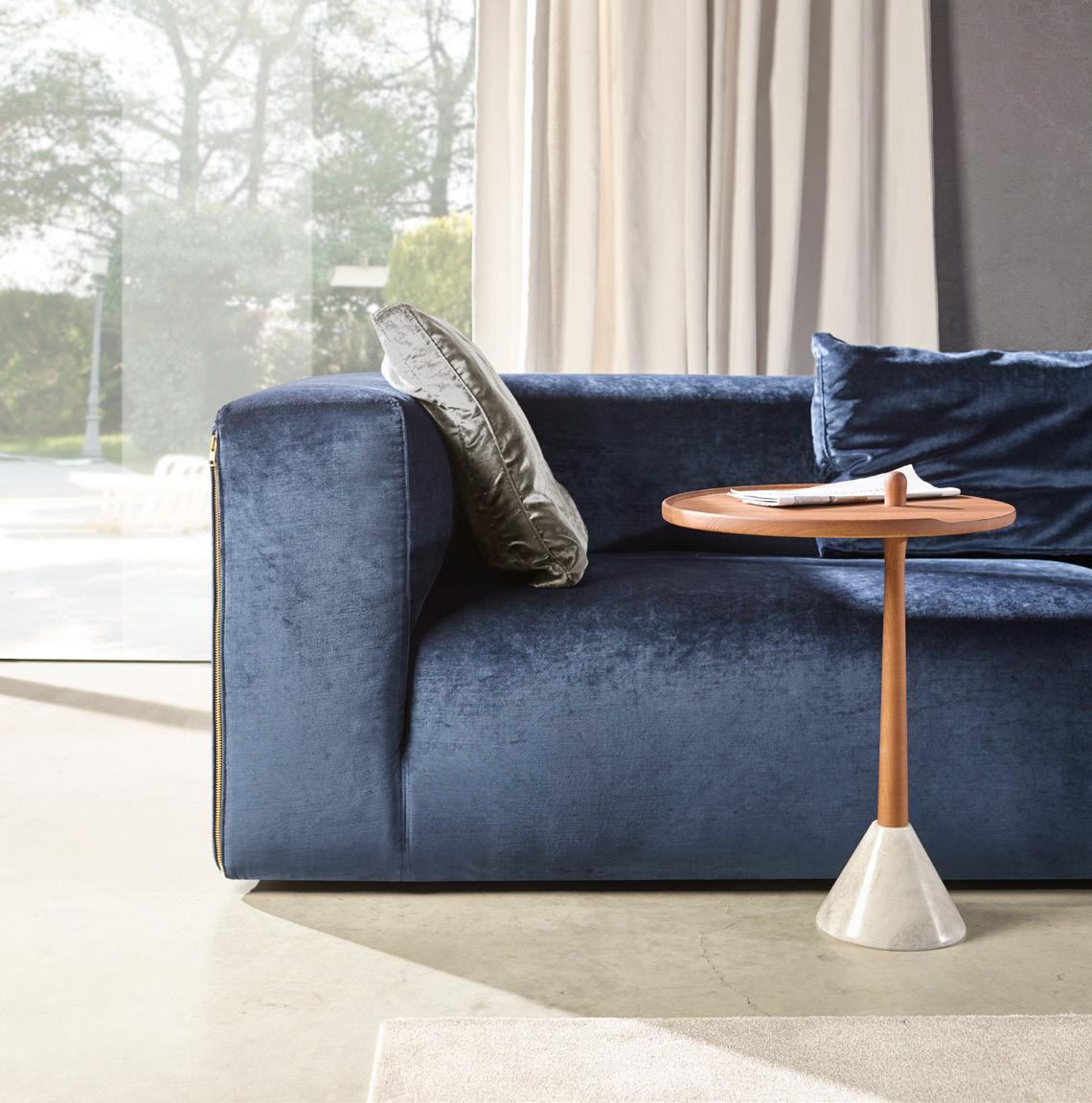 ILUM sofa, OP.1 (1 seat cushion). Dimensions CM 246x103 H85. ARKO armchair, steel baseboard. Dimensions CM 82x70 H71. LAYA side table, white marble and walnut finish wood. Dimensions CM 120x70 H40. LUXU side tables, iroko finish. Dimensions CM (Ø50 H42) + (Ø40 H34)