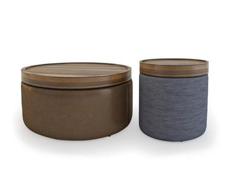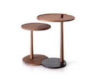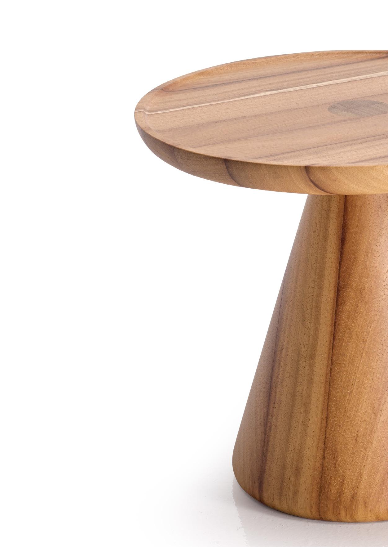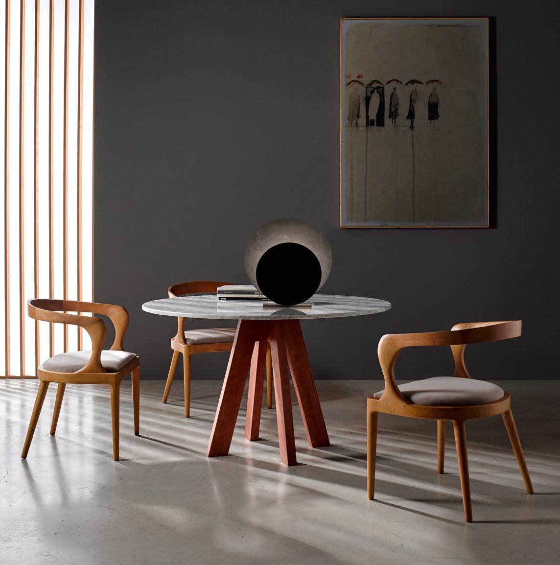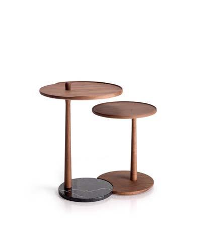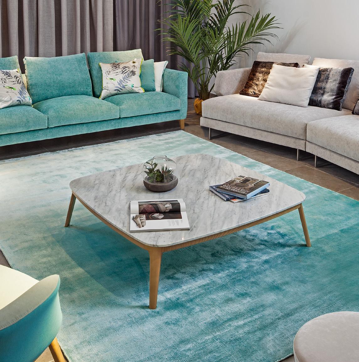 ILUM sofa, OP.1 (1 seat cushion). Dimensions CM 246x103 H85. ARKO armchair, steel baseboard. Dimensions CM 82x70 H71. LAYA side table, white marble and walnut finish wood. Dimensions CM 120x70 H40. LUXU side tables, iroko finish. Dimensions CM (Ø50 H42) + (Ø40 H34)