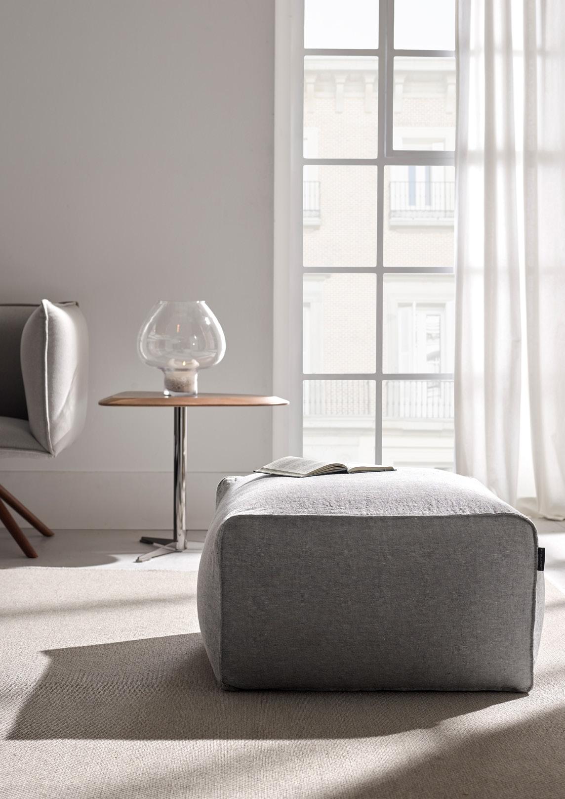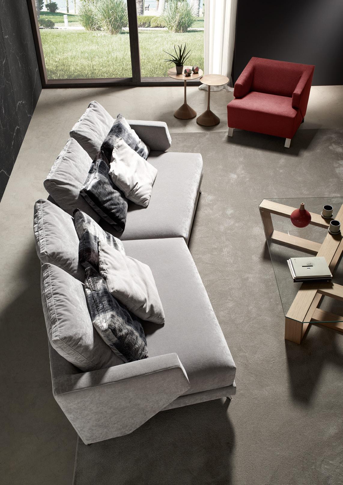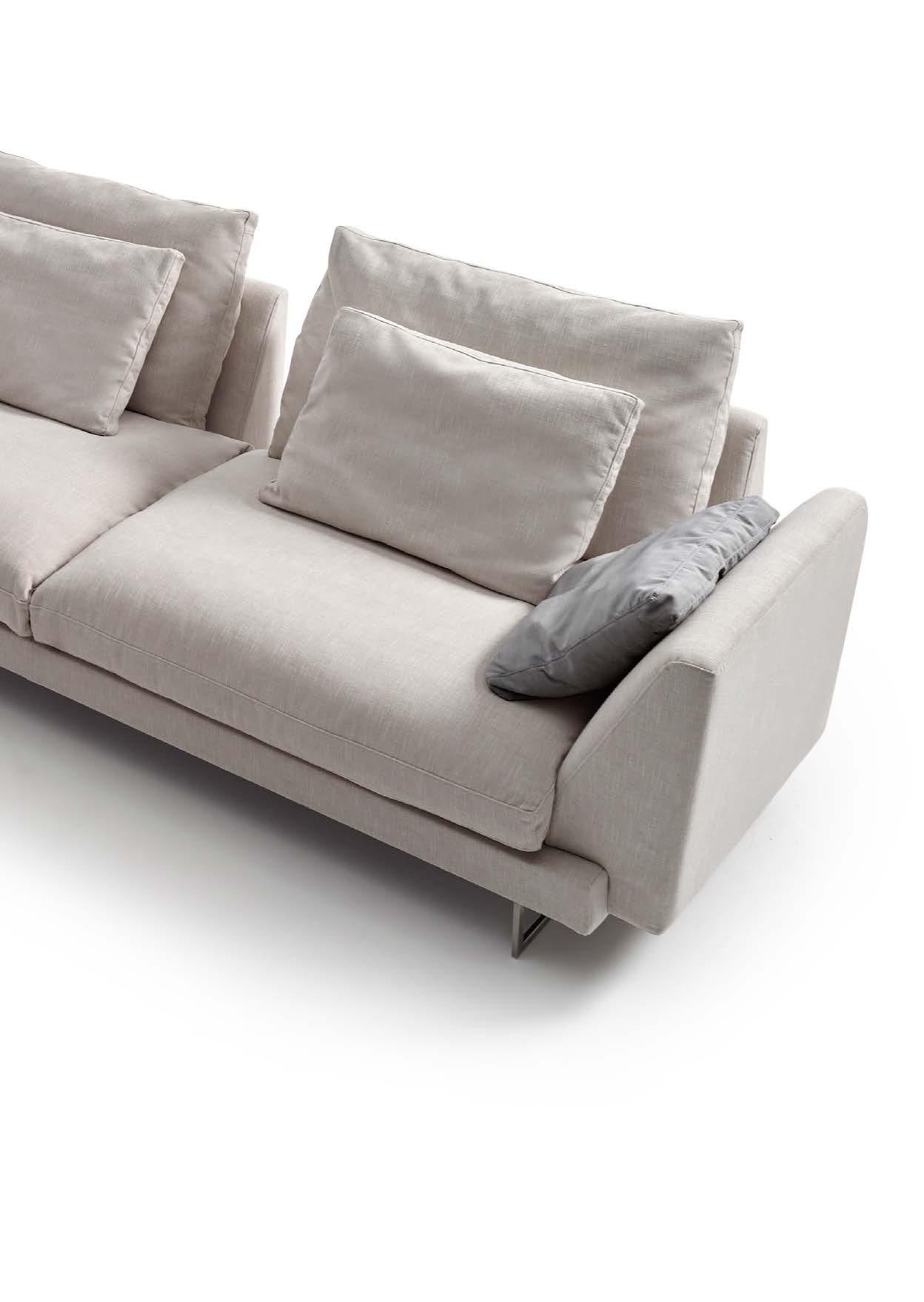Egos designed to adorn contemporary and harmonic spaces in which the details are of great importance. With the possibility of choosing between two different types of arms. Sofa or modules greater than 200 cm are prepared so that arms can be removed on site. Includes a throw cushion for each arm (37x47cm). Option: sliding seat and backrest, moving together into a reclining position.