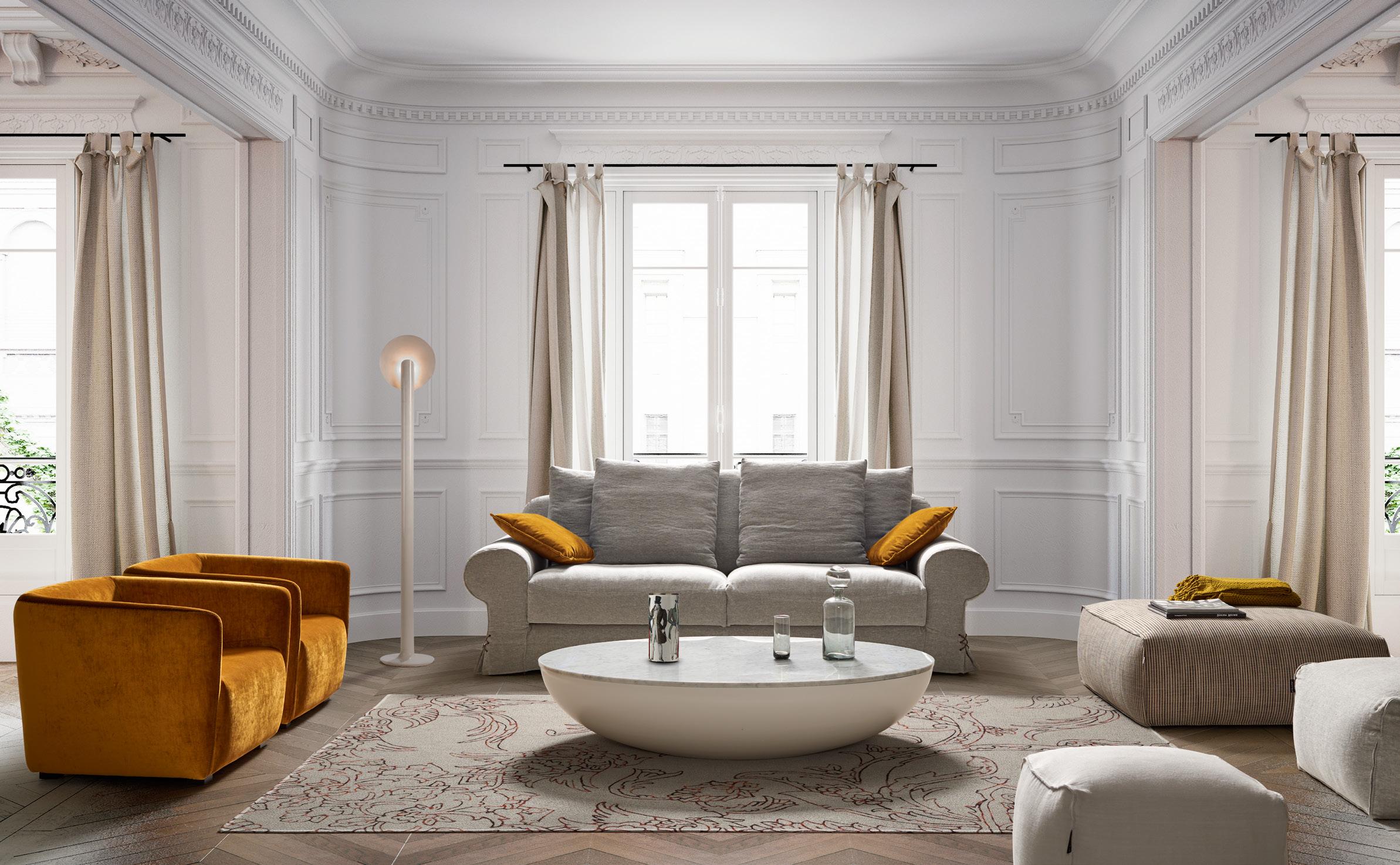 Erik, cette proposition a comme but le résultat d’une synthèse entre innovation et le classicisme, qui se caractérise par la possibilité de créer un espace confortable autour du canapé, grâce à sa géométrie. L’ensemble accoudoir-dossier met en évidence sa conception, par la volonté d’offrir une touche distinctive et moderne.