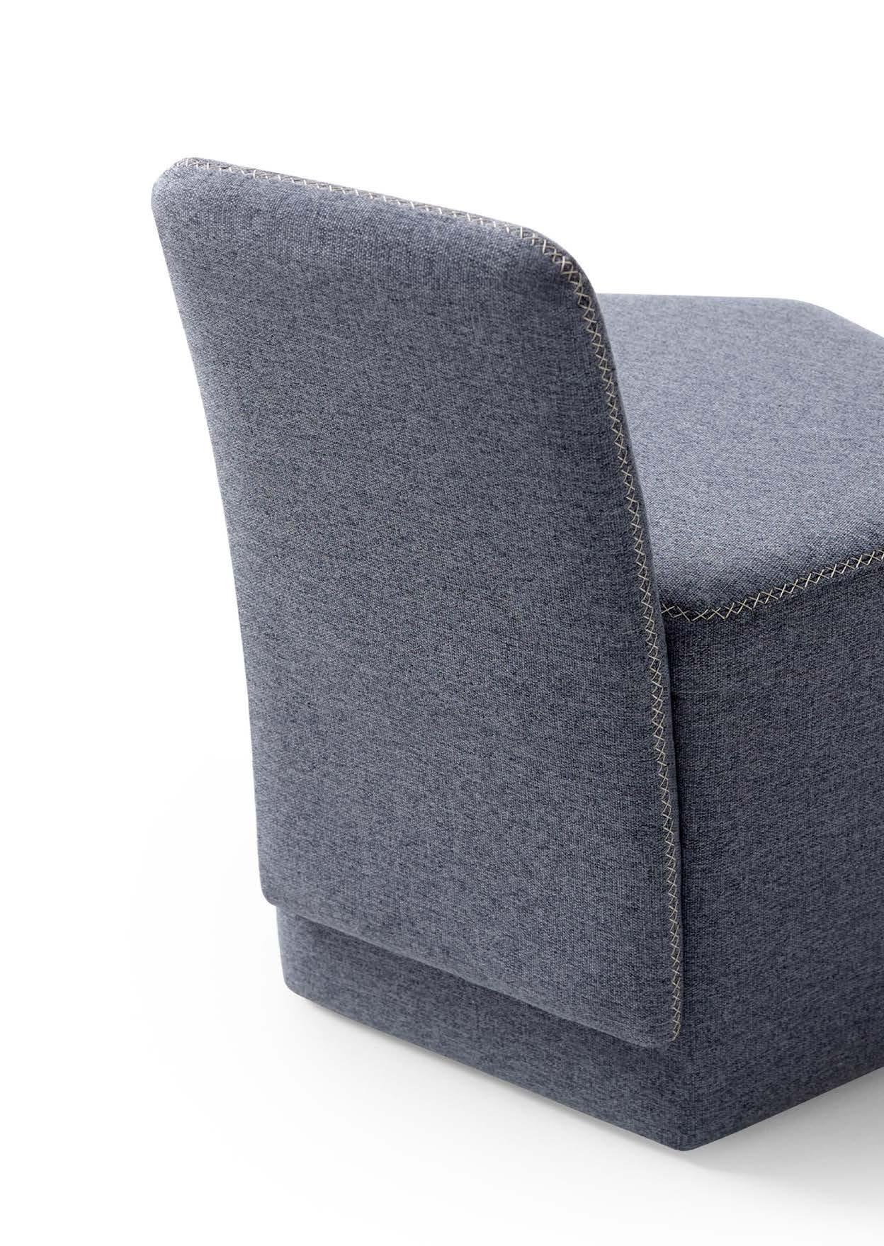 Wing, a system of upholstery that allows great flexibility starting with the bench as the basic element, and adding elements, such as the arms and back, to create configurations that meet bespoke requirements or choose the recommended arrangements. It is not a sofa, but a seating system in which its identity gives the ability for it to be transformed due to the interchangeable elements.