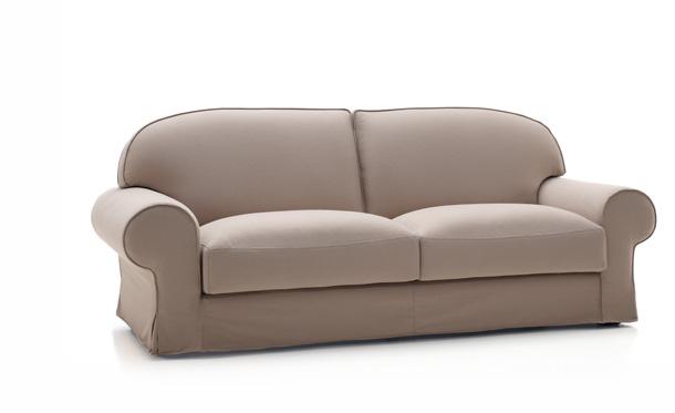 Musa, a classically shaped sofa. Large cylindrical arms and turned legs make it ideal for the decor of more conservative environments. Offers the possibility to choose one of two types of back rest, Op1 conventional large cushion, Op2 cushion (66 x 66) with a more informal style.