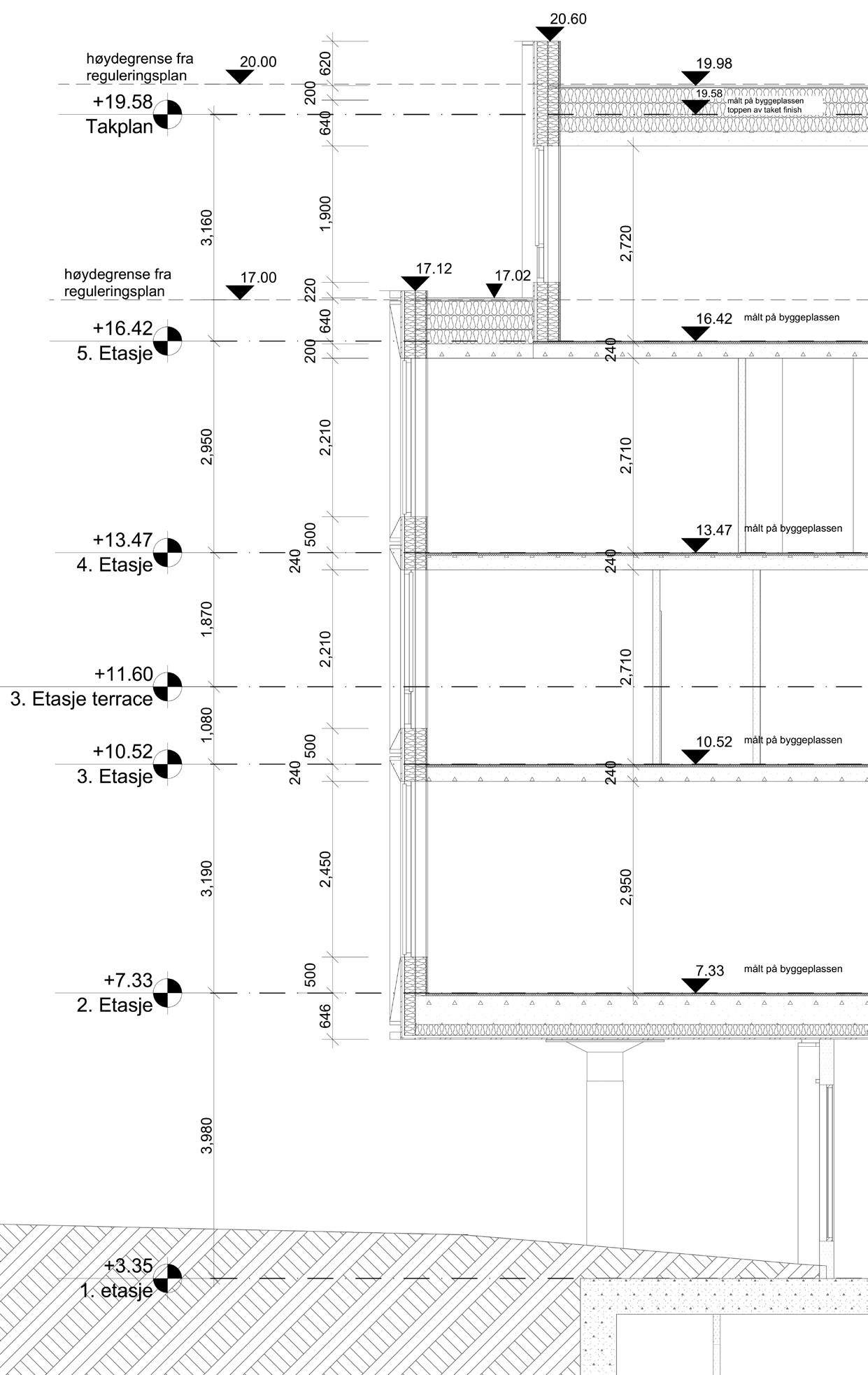 Austadbygget in Tromso, Norway is a renovation project of a five-story building in the city center, offices occupy 4 floors, the first level has a pharmacy and a big cozy cafe. The building’s first floor is recessed, has a gallery with uniquely shaped concrete columns and prominent continuous glazing. The main facade is covered with brick-colored metal sheets and has paired narrow window openings. Old facade section drawings showed insufficient insulation in the walls and an outdated wooden framework enclosed between concrete load-bearing columns, later disassembly of a wall on-site proved that.