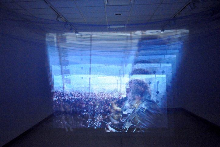 7 screens made of the same translucent mesh hang at the same distance from each other, the same image transmitted from the projector is broadcast on them. But each subsequent layer changes the picture and space, distorting it in its own way.