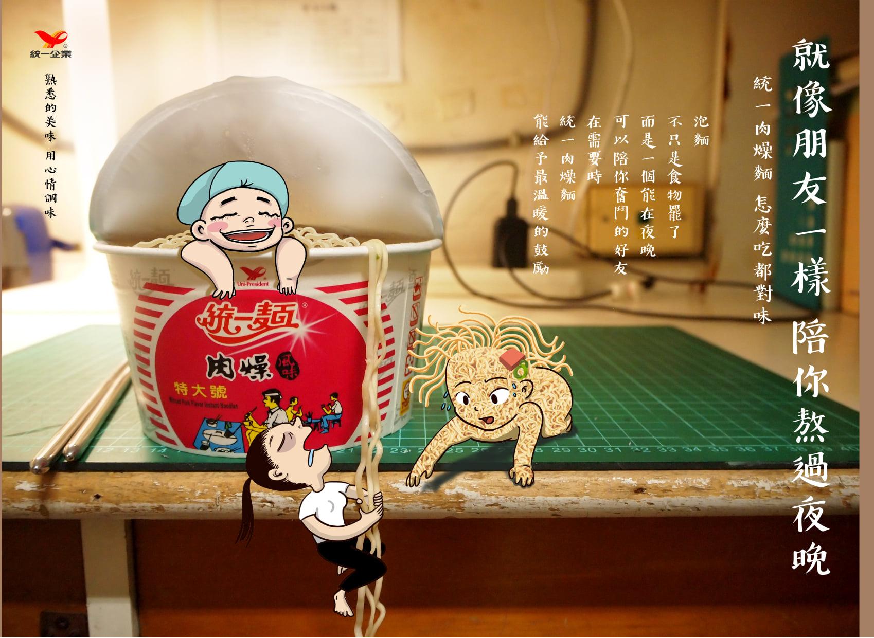 統一肉燥麵 現在的大學生,常常為了作業而熬夜。 若能有個像朋友一樣的存在陪伴,同時又能溫暖我們的心, 在需要的時候給予支持和幫助的話,我想那就是泡麵無誤了。 31