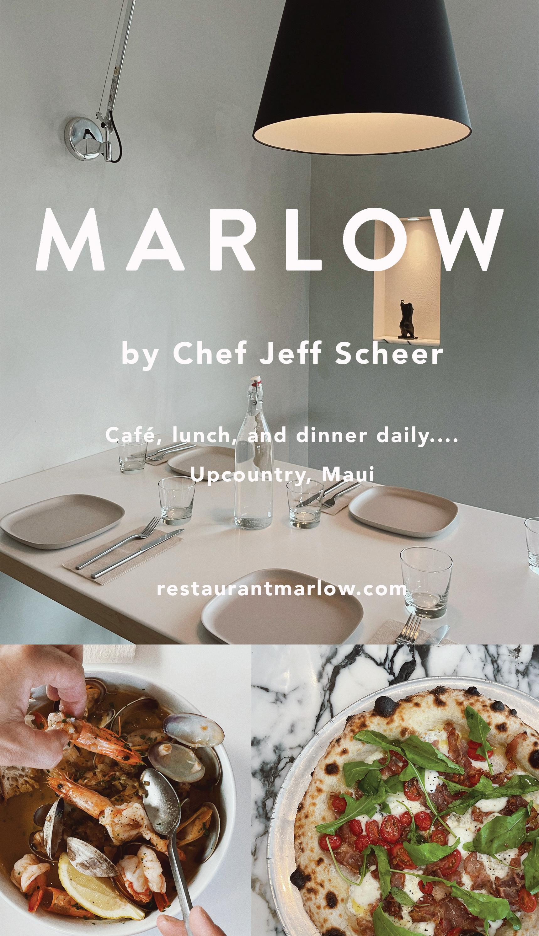 At Marlow we specialize in artisan style, neapolitan sourdough pizza, as well as locally sourced meats and vegetables. Our menu, space, and offerings change seasonally. Chef/Owners Jeff and Kaili Scheer have always loved to entertain at their home in Kula. The concept for the restaurant is an extension of that warm hospitality felt while sharing good food and good wine around a table of family and friends. When the restaurant industry shut down in March of 2020, the pair began making sourdough pizza out of their outdoor oven at home. Milling whole wheat berries from a farm in Arizona, hand stretching mozzarella, whole-animal butchery, growing artichokes and summer squash for toppings - it was a true labor of love. What began as a ritual has grown into a restaurant. We look forward to seeing you at Marlow soon…