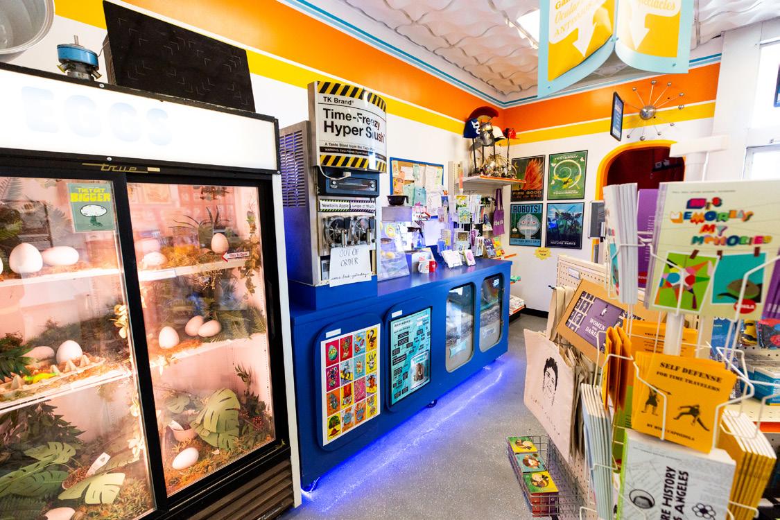 En una brillante y fría mañana de jueves, casi dos años después de que 826LA cerrará nuestros centros debido al COVID-19, los estudiantes de cuarto grado de la escuela primaria Grand View Boulevard hicieron fila afuera del Time Travel Mart en Mar Vista. Un skater local realizó trucos, encantado con la improvisada audiencia. Los estudiantes se abrieron paso a través de la tienda (libros pasados, artículos diversos para viajar en el tiempo y un robot oxidado) hasta el laboratorio de escritura.