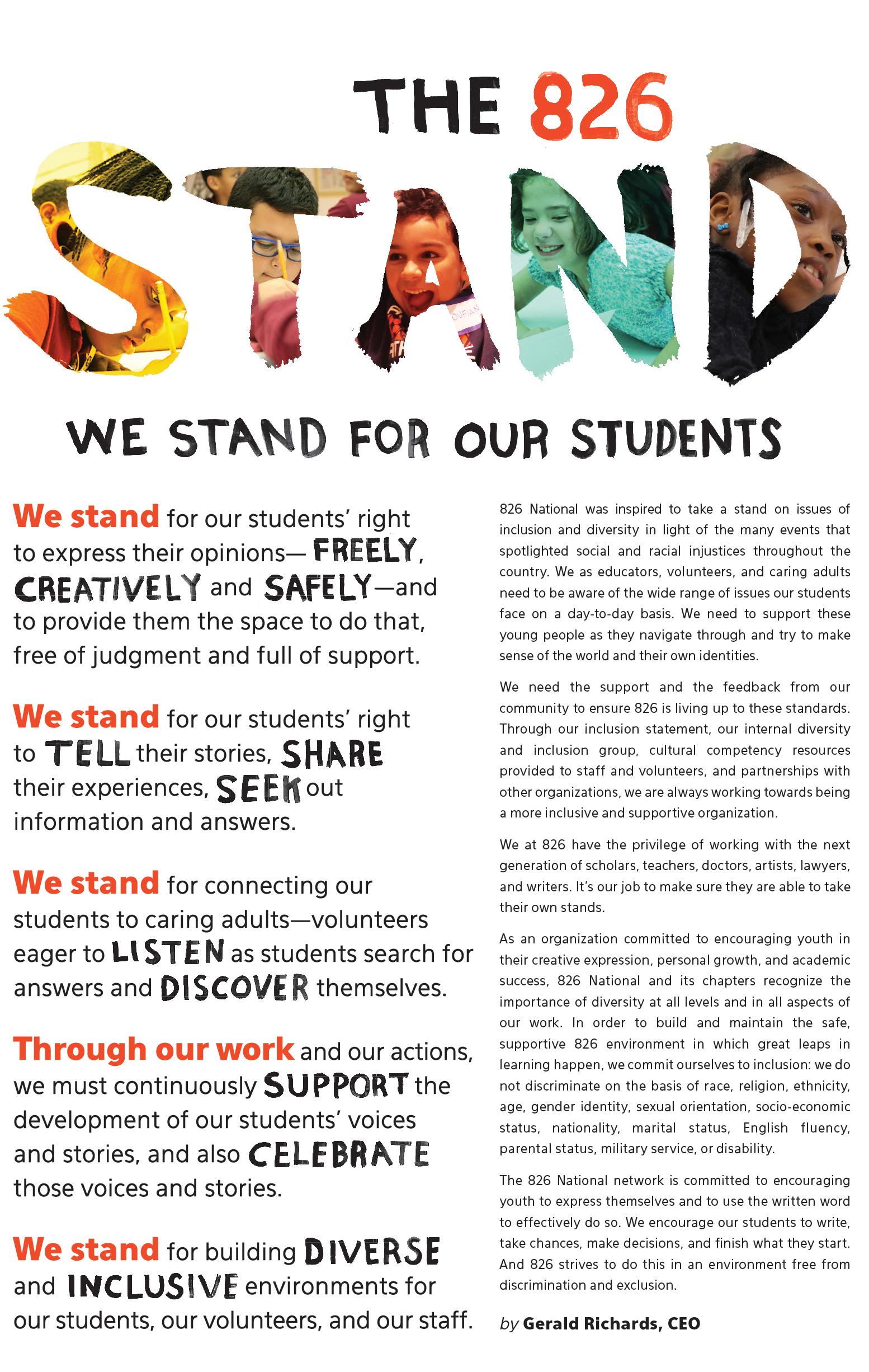 As an organization committed to encouraging youth in their creative expression, personal growth, and academic success, 826 National and its chapters recognize the importance of diversity at all levels and in all aspects of our work. In order to build and maintain the safe, supportive 826 environment in which great leaps of learning occur, we commit to inclusion: We will not discriminate on the basis of race, religion, ethnicity, age, gender identity, sexual orientation, socio-economic status, nationality, marital status, English fluency, parental status, immigration status, military service, or disability.