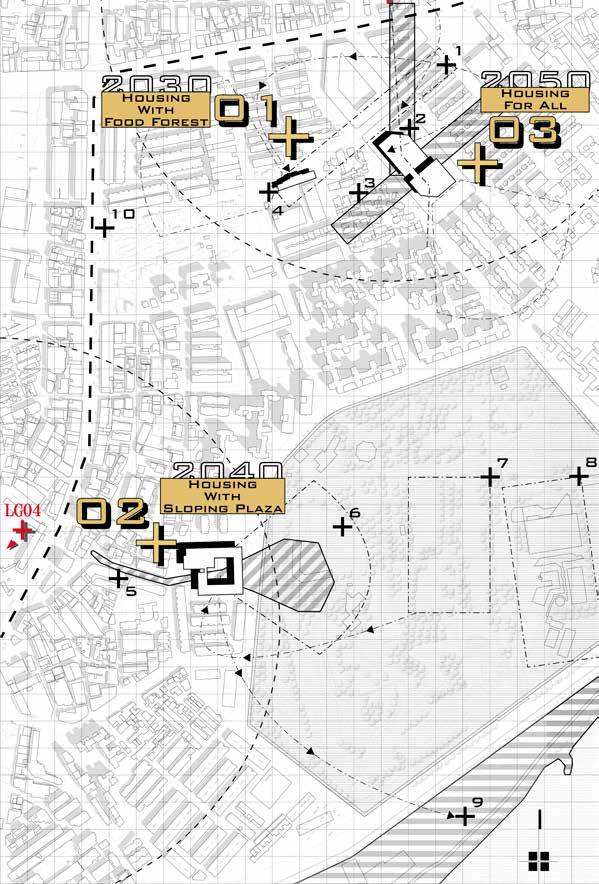 在嘗試過小尺度的基地後,我希望擴大尺度,試著讓這樣共融的生活方式擴大 到較大的社區之中,也期待與外部的環境做連結,回應周遭各種不同的都市機 能。