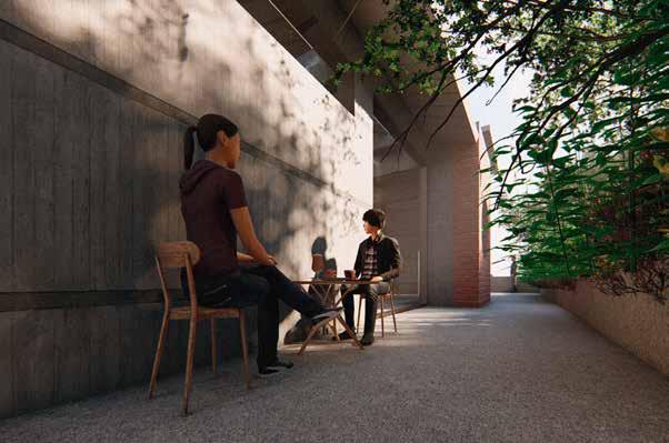 回應周遭屬於純住宅區域,我希望食物森林的概念能夠與周遭的鄰里 透過分享,進而產生更多的交流,在街口的食物森林是一個周遭社區的居民能 夠在散步時順道而來的空間,對應食物森林的空間是社區的小型集會所,在耕 種、採收之餘,居民可以在屋簷下乘涼,休息、聊天,甚至是在一樓的共食餐 廳內簡單的料理收成的蔬果,並與大家分享。