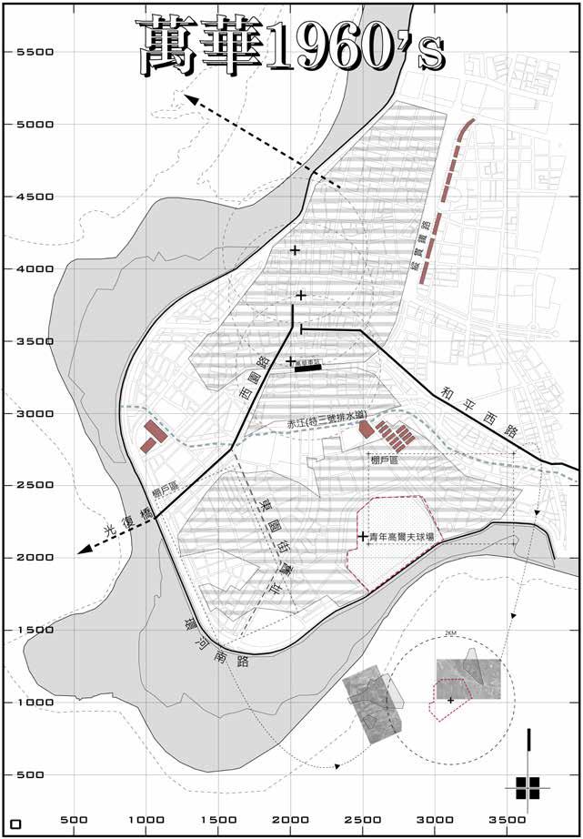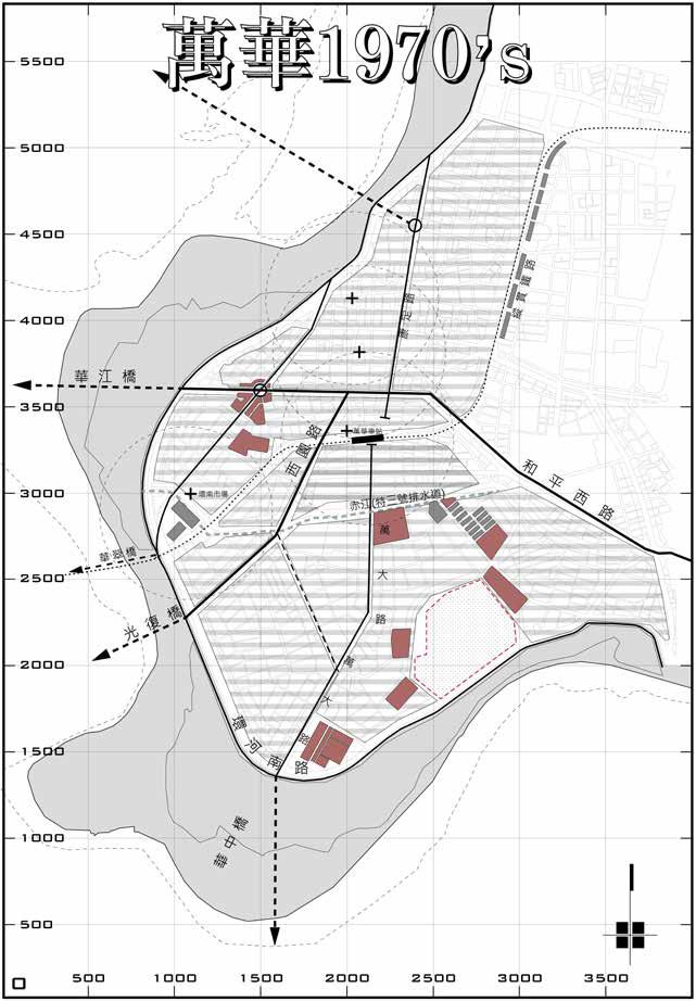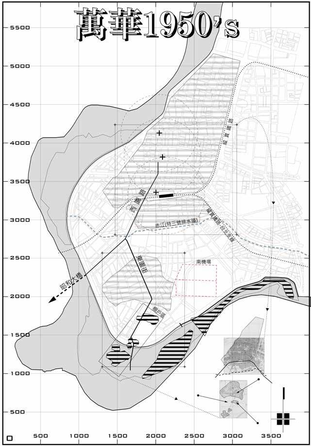 1-1 1972萬大計畫: 南萬華地區古稱加蚋仔,即指新店溪環繞艋舺市街以南的區域。日治 時期至戰後初期,此區為農產產業,生產蔬菜或經濟作物如茉莉花、竹筍,就 近供應台北市。溝通中和區的重要道路「枋寮道」即東園街,於中段形成「店 仔口」商業街。太平洋戰爭末期,日本政府徵地擴建南機場軍事設施,使得國 民政府後續於南機場興建公寓住宅容納都市人口。