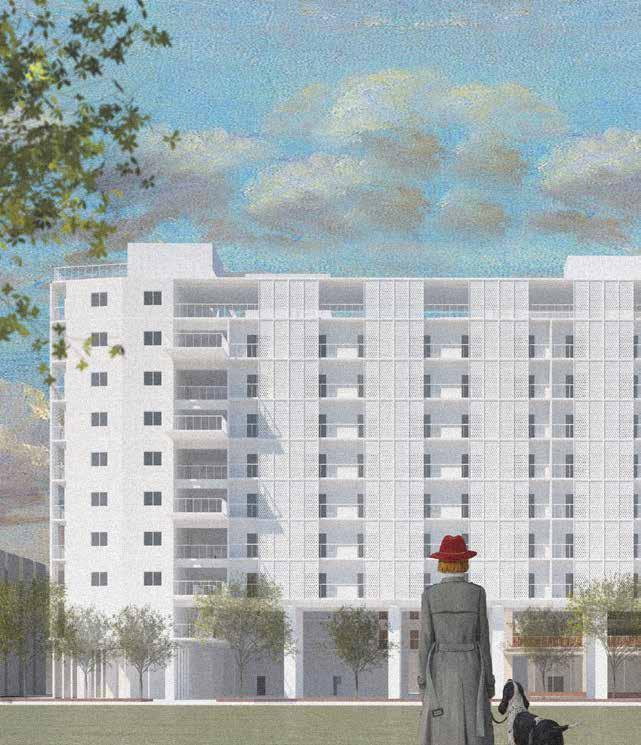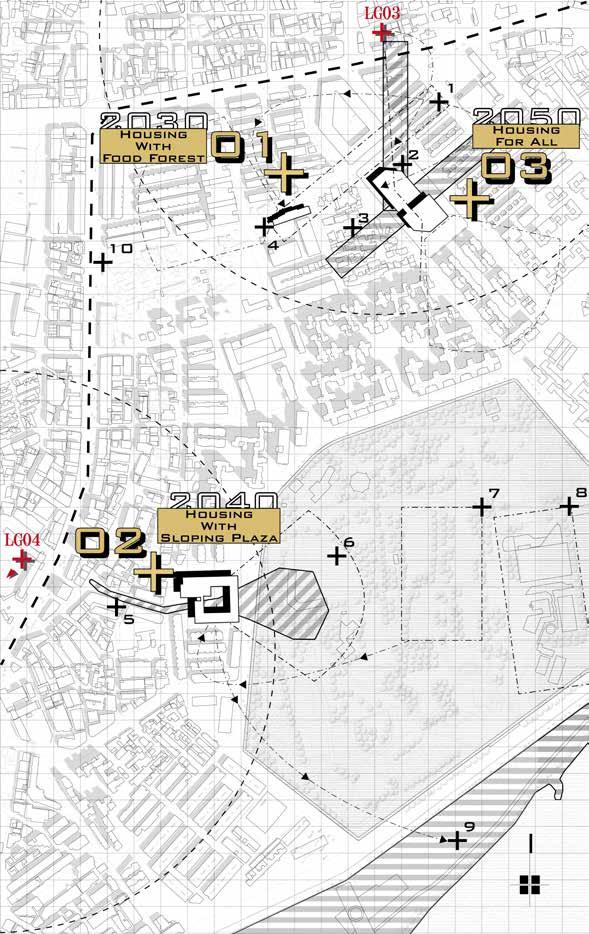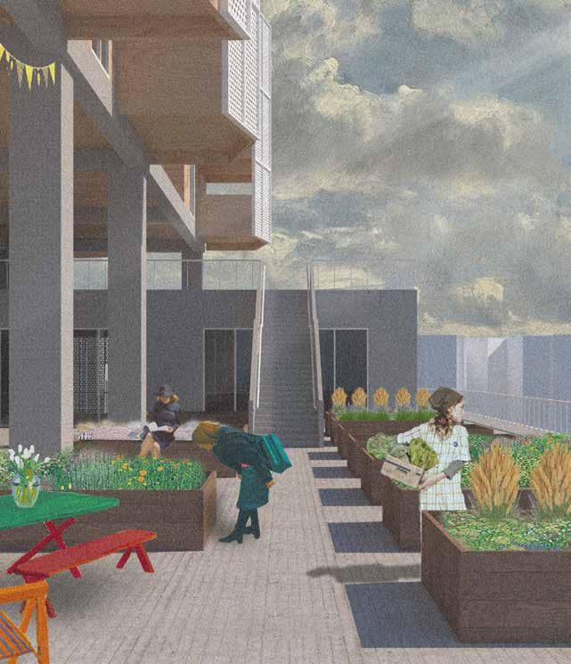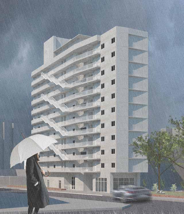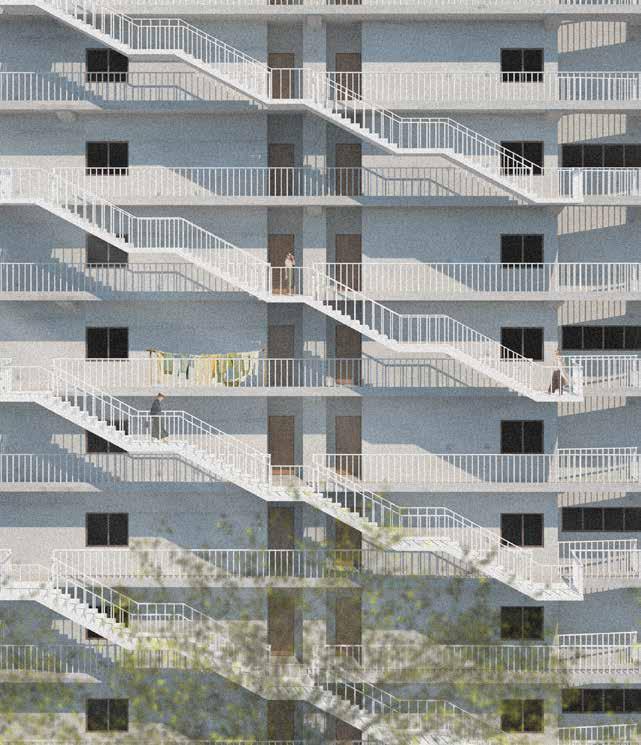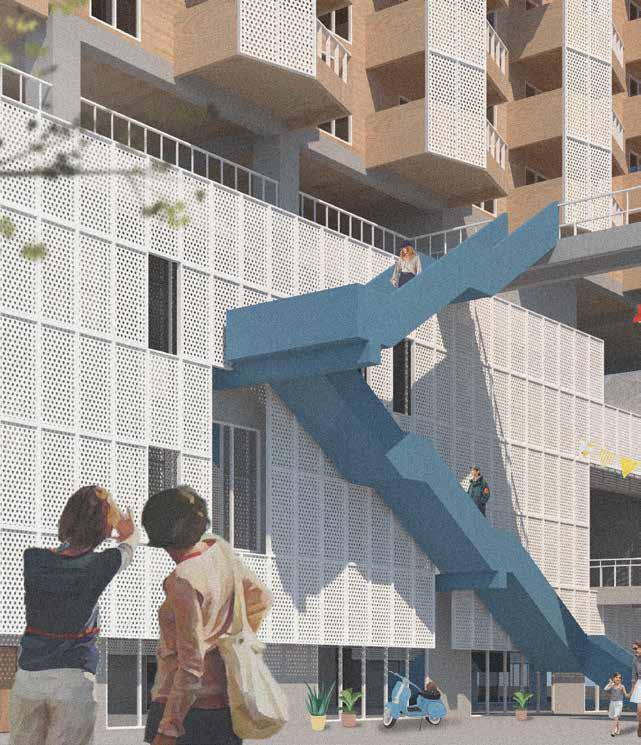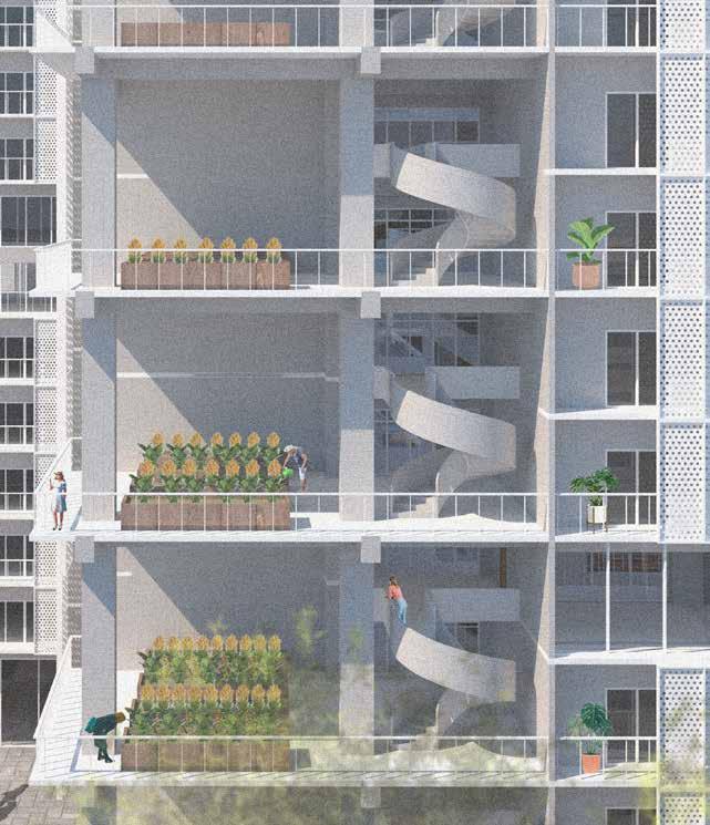 第一階段:Housing With Food Forest 在中型的尺度內以都市農園、共食計畫為主軸的合作住宅,共享空間 安排在垂直與水平動線的交點,位住戶的生活賦予一層儀式感,立面上外挑的 樓梯貫穿了住戶生活的樓層,打破柱樑牆板的物理限制,並且提出可運作的模 型。