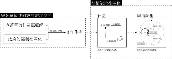 現代社會的觀念的進步與開放,社會上能夠接受各個族群的程度越來 越高,而在思考下一個時代的住宅應該有甚麼樣的鄰里關係時,應當將異質性 與多樣性看做資源,在空間與社會結構中相互應對,並以這些資源為基礎,建 立共融與可被識別的鄰里關係。拼接家庭的概念由此而來,原生家庭的關係建 立在血緣的依存,拼接家庭則是自主選擇,共同承諾的生活夥伴。正因為信任 的基礎始於自覺自願的互助與合作,而非血緣的理所當然,合作住宅得以在各 式生命課題上相互提供必要的支援,合作住宅中大家庭的接納共融會成為最人 性而非機構性的庇護。